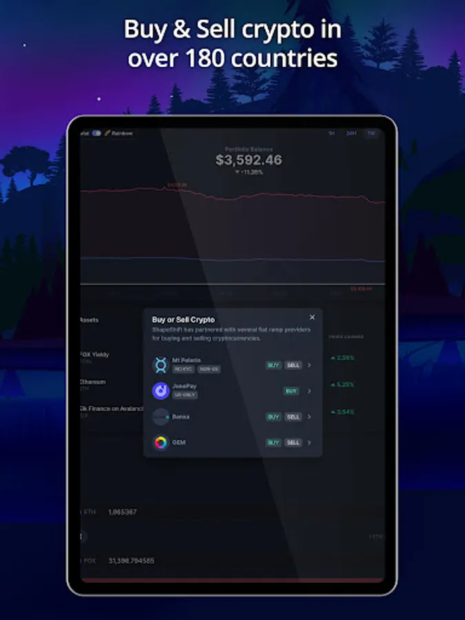 The ability to purchase crypto has never been easier! Easily on and off-ramp BTC, ETH, USDC, AAVE, LINK, UNI, DAI, BUSD, and 100’s of the top crypto assets with your debit card, credit card, or bank transfer on our community-owned platform. Offering more on/off -ramp solutions and digital assets than ever before一ShapeShift is your one-stop Web3 shop! Our ramps are available in over 160 countries and offer some of the industry’s most competitive rates.