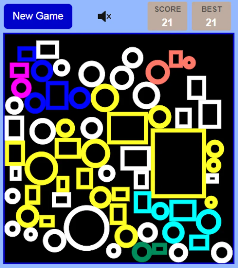 Touch to grow squares and circles. When the new shape touches an existing shape of a different kind, they join in a chain. Links in one chain have the same color. White links do not belong to any chain. If the new shape cannot fit, a minimal dotted outline is shown. Try to connect 2 chains.