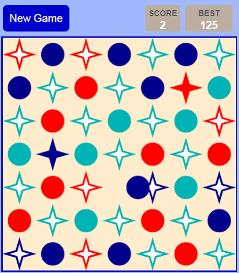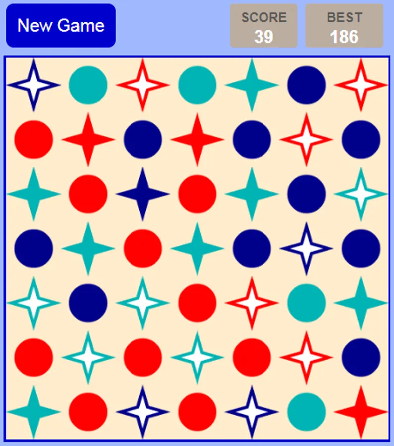 Drag a color disk onto its neighboring hollow star of same color, to fill the star and get a point. A new color disk will replace the old one -- drag it to fill another hollow star if possible. When a diagonal of stars is filled, they turn hollow. Get more points by filling more stars.