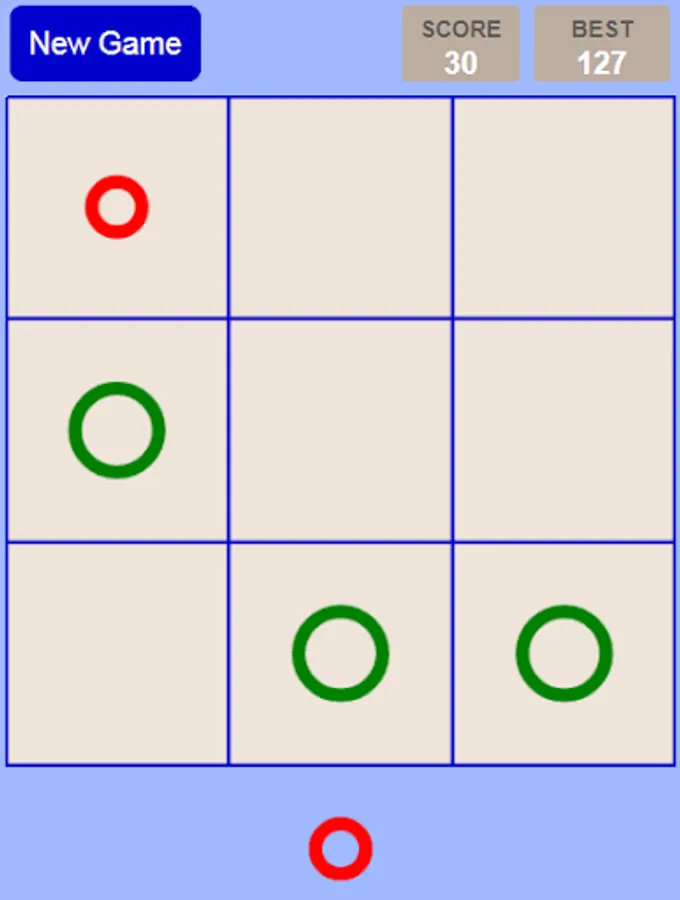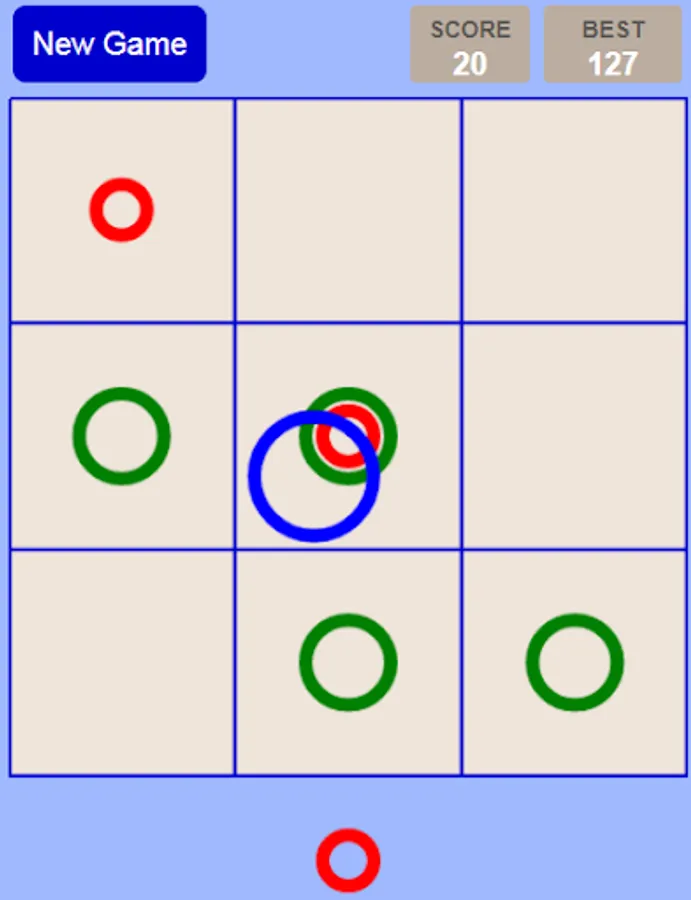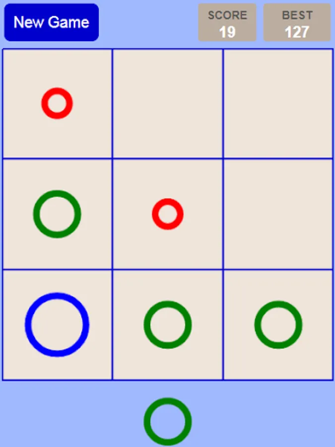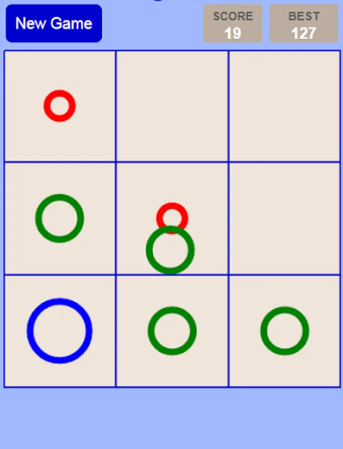Drag a new ring from outside into the table. If a cell already has a ring or rings, you can add the new ring if it is larger than the existing ring or rings. You can re-drag the largest ring from one cell into another. If a cell contains all three sizes of rings, they all disappear and the cell becomes empty again.