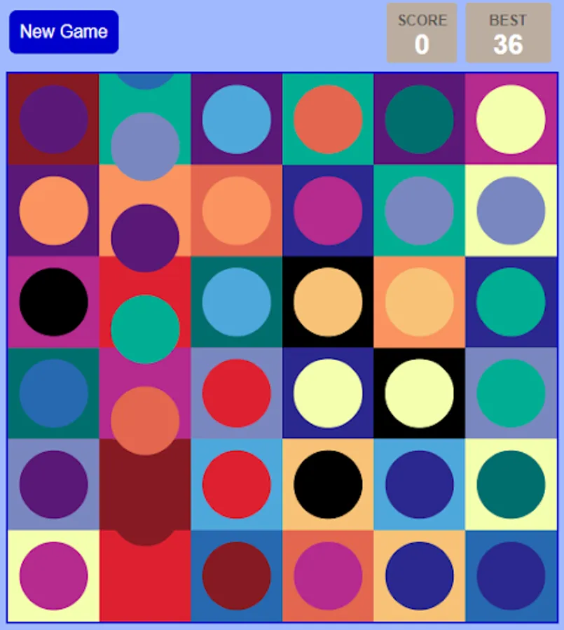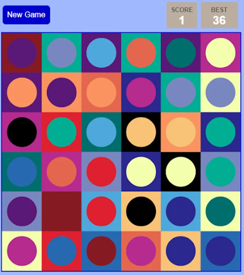 Move horizontal and vertical rows of circles. When a circle color matches a cell, it stays. Unmatched circles jump over matched stuck circles while moving. The goal is to match most circles to cells.