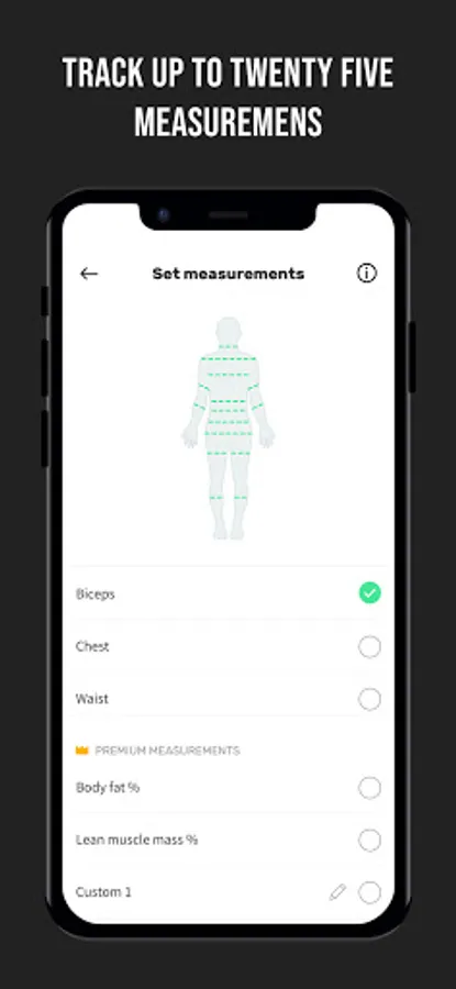 - Select up to 11 points of measurements: Neck, Shoulders, Chest, Biceps, Forearms, Waist, Abdomen, Hips, Buttocks, Thighs or Calves