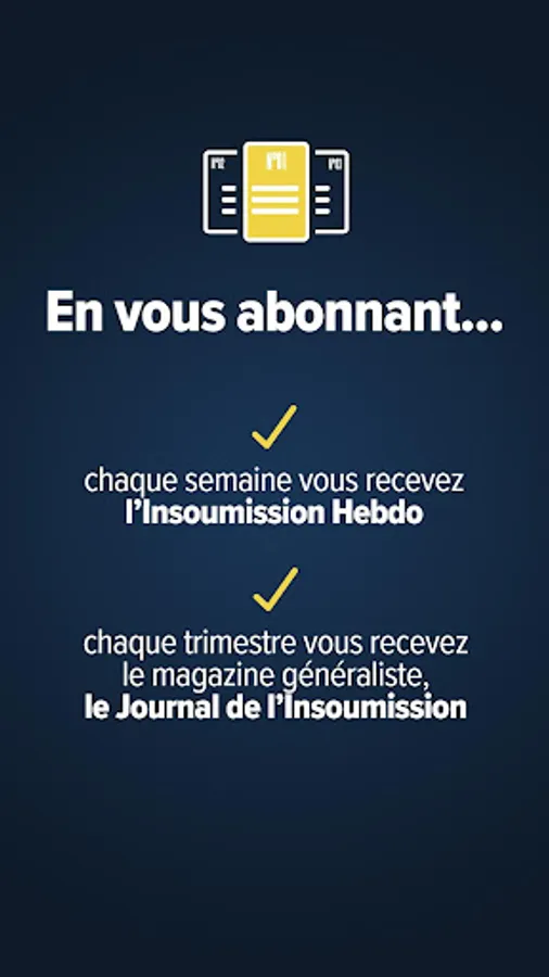 Subscribe to the Pack (bundled offer) to receive CHEZ VOUS every week, L'Insoumission weekly and every quarter, the magazine Le Journal de Insoumission for 66 euros per year.