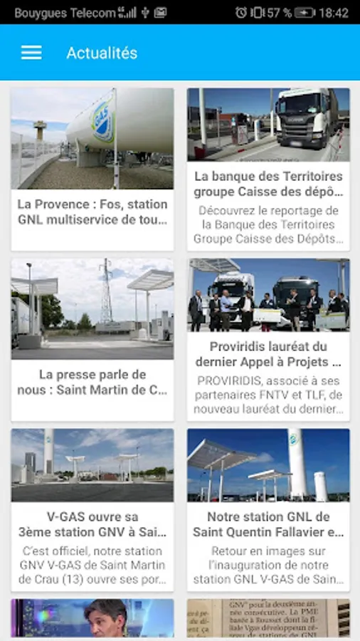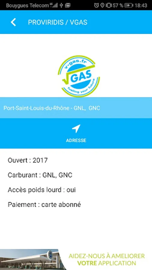 The V-GAS application is above all the interactive map of the CNG (natural gas for vehicles) sector in France. Developed from Open Data GrtGaz this application aims to offer a service adapted to drivers and carriers wishing to find the LNG / CNG / BioGNC station closest to their position and also find information such as: address, the number of pumps available, the fuel (s) available and the specificities specific to each station. In addition, the application gives the news of the company Proviridis and its brand V-GAS.