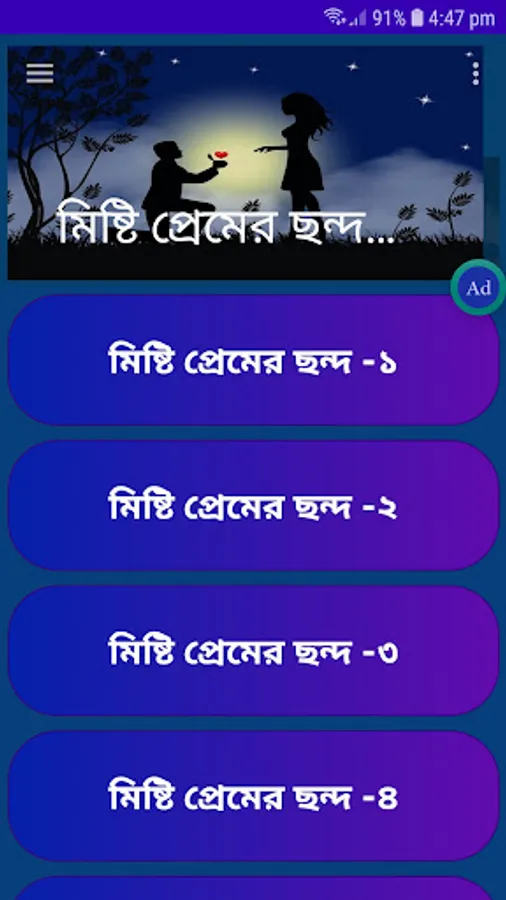 👉👉 আমাদের মিষ্টি প্রেমের ছন্দ Misti Pramer Condo এ্যাপটি তে যেসব ধরনের মিষ্টি মিষ্টি ছন্দ রয়েছে তা নিচে দেওয়া হলো 👉👉