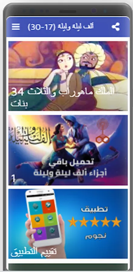 A Thousand and One Nights Voice app without a net. Inside, you will find the nights from 523 to 552, and it contains the story of King Mahorab and the three daughters, A Thousand Nights. Hear from the burial treasures of the Egyptian Radio. The Thousand and One Nights apps are divided into about 30 parts and may be missing a flip in each part or an entire story app, depending on its size. You can listen to the stories of A Thousand and One Nights in full voice and without the net and enjoy them anywhere, just download the application, put the headset in your ear, and listen to the stories of the Thousand and One Nights exciting and wonderful. Enjoy the stories of One Thousand and One Nights in Mossasil, while traveling and while relaxing at home.