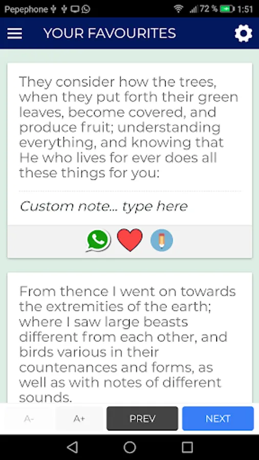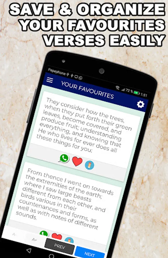 You could create your custom favourites verses list with a single click! Add any quote to favouires: Click on love icon while you are reading a verse so you could save it in a custom favourites list. You could access to favourites quotes at any moment.