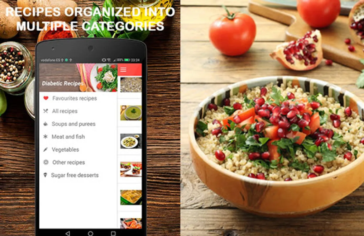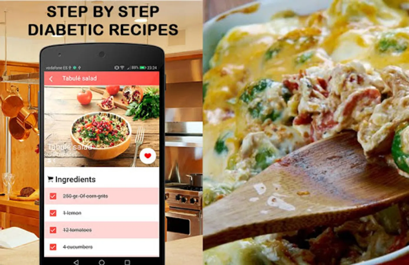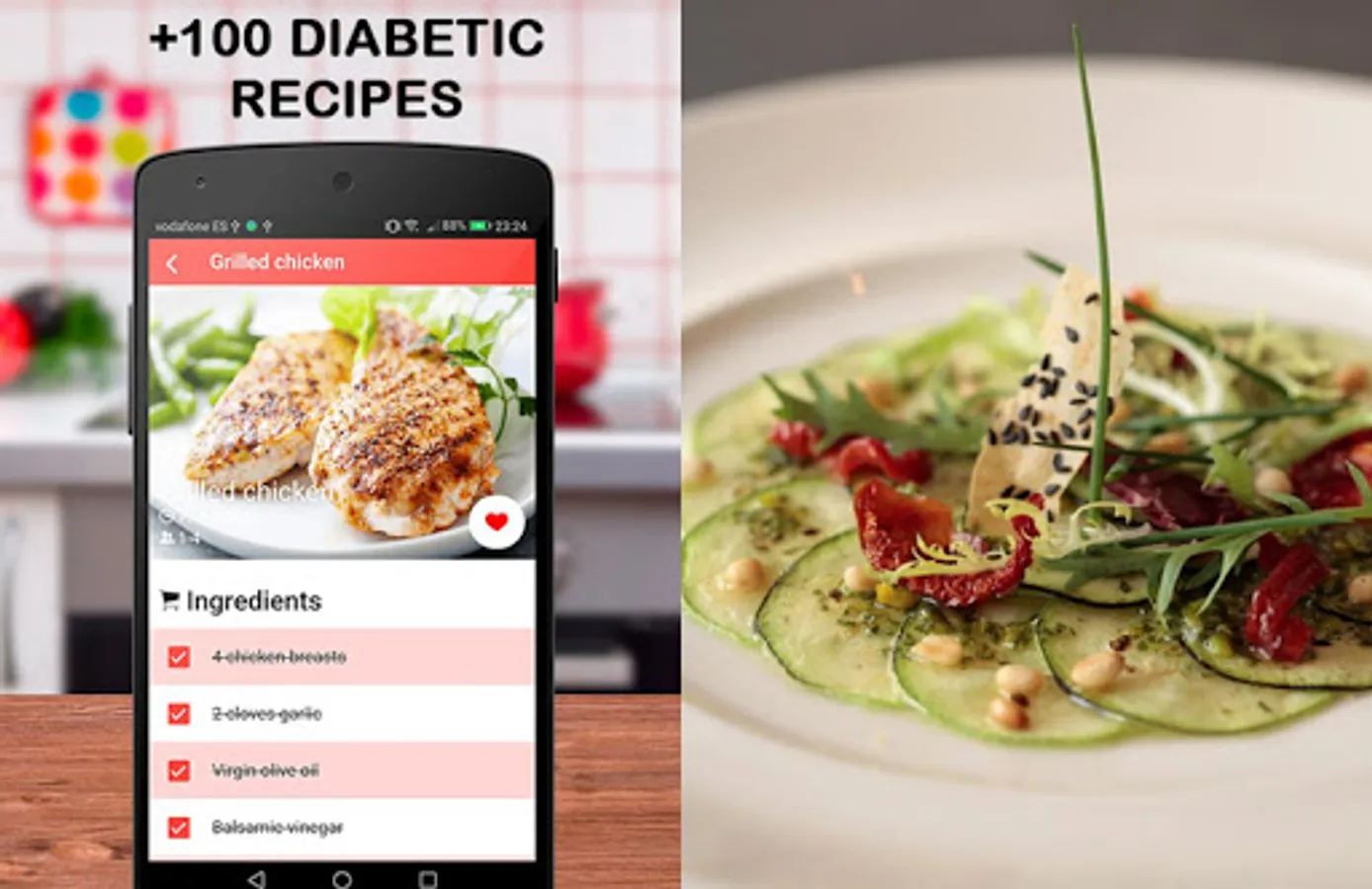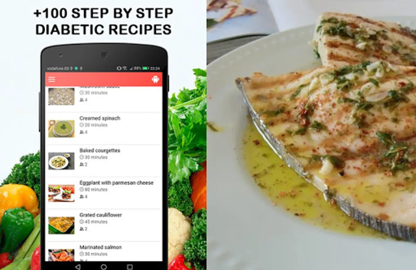 Diabetic recipes free application which includes over 100 meals. Do you know about diabetes? It is a common metabolic disorder that affect to lot of people all around the world. High blood sugar levels must be checked and so meals are really important. High sugar content meals are not appropiate for people who suffer this illness, neither a high consumption of high carbs food.