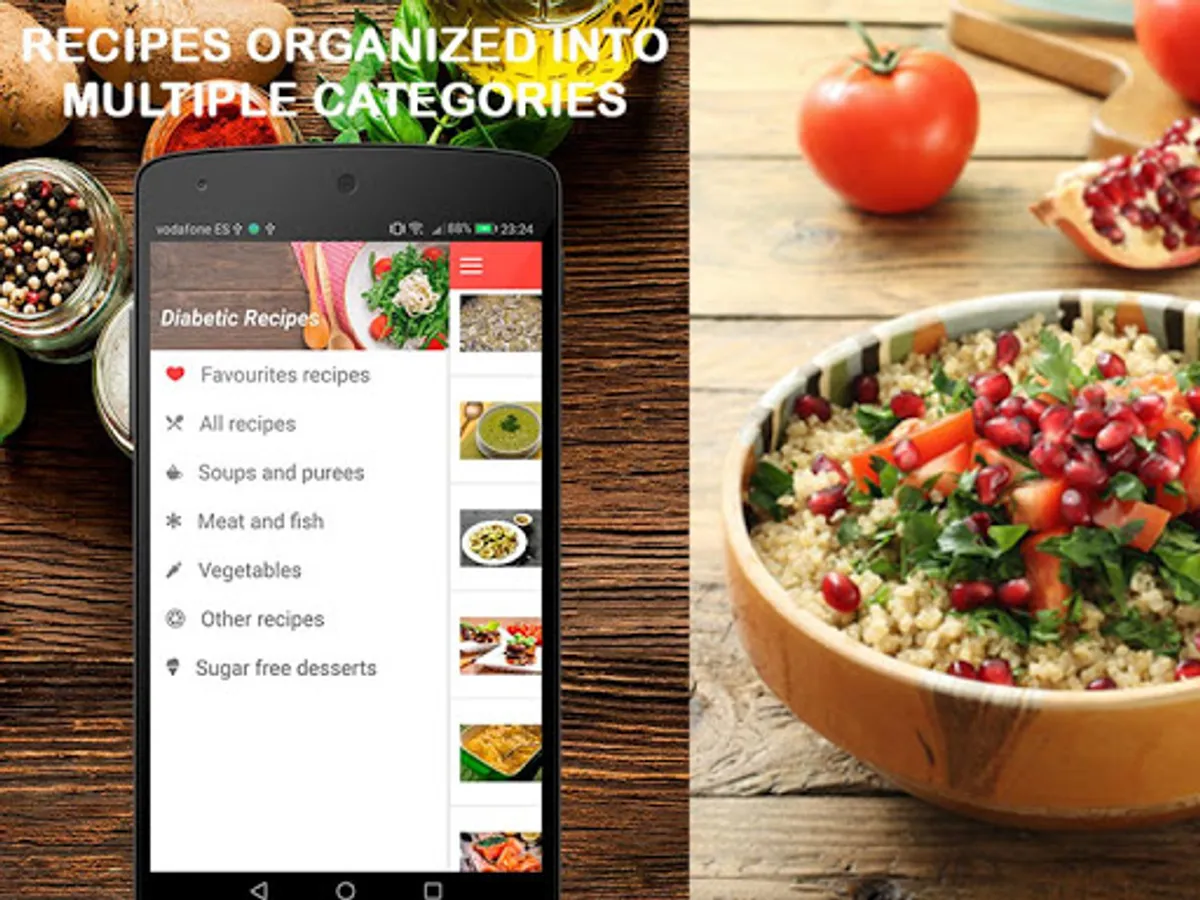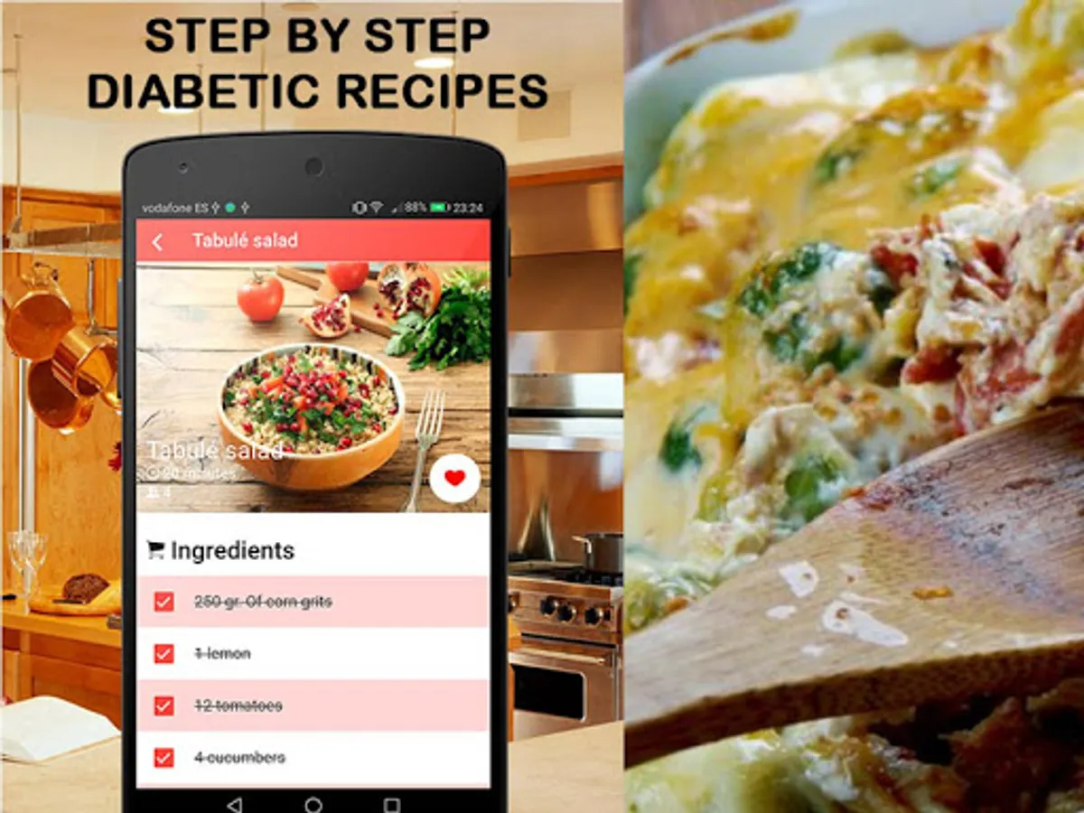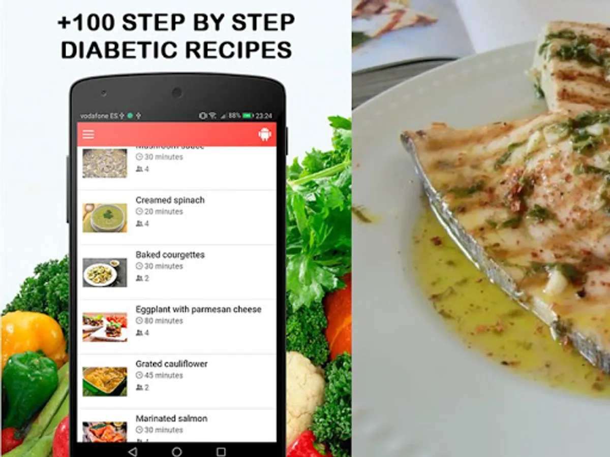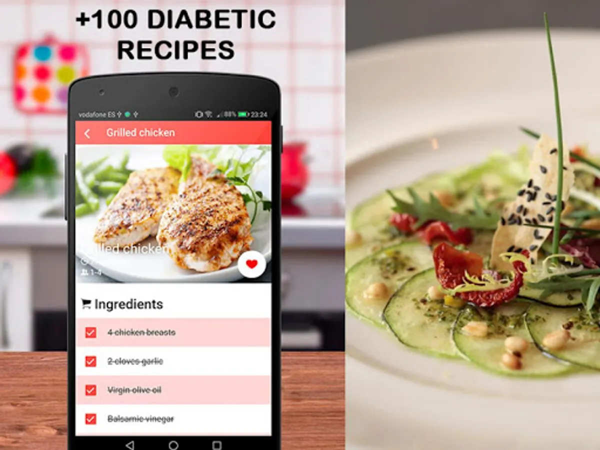 Diabetic recipes free application which includes over 100 meals. Do you know about diabetes? It is a common metabolic disorder that affect to lot of people all around the world. High blood sugar levels must be checked and so meals are really important. High sugar content meals are not appropiate for people who suffer this illness, neither a high consumption of high carbs food.