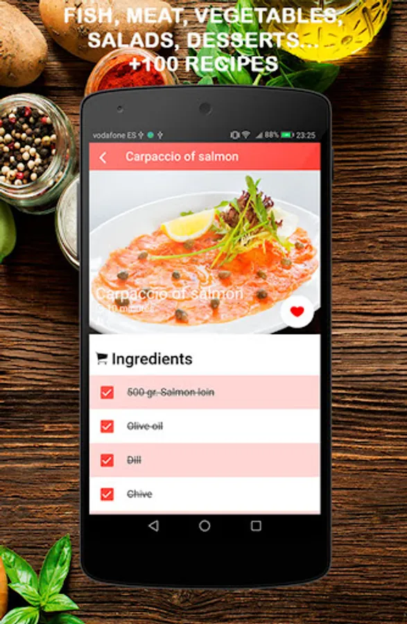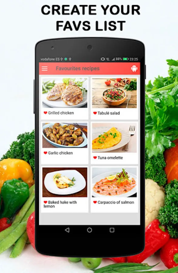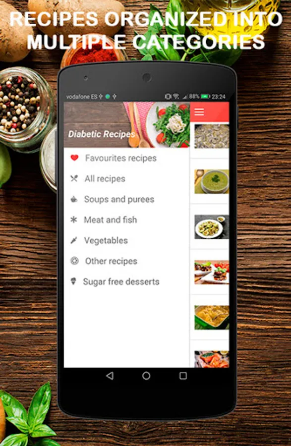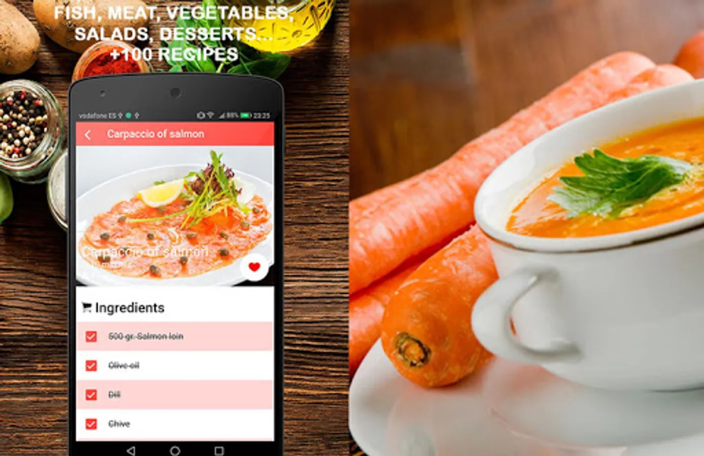 Diabetic recipes APP includes different types of food, such as meat, fish, salads and vegetables, soups, sugar free desserts and much more. In addition, there are different types of low carb meals, gluten-free and more. All of them are included to let you cooking them in a really easy way. There are many soups and creams included, so you can use them to prepare your custom meals.