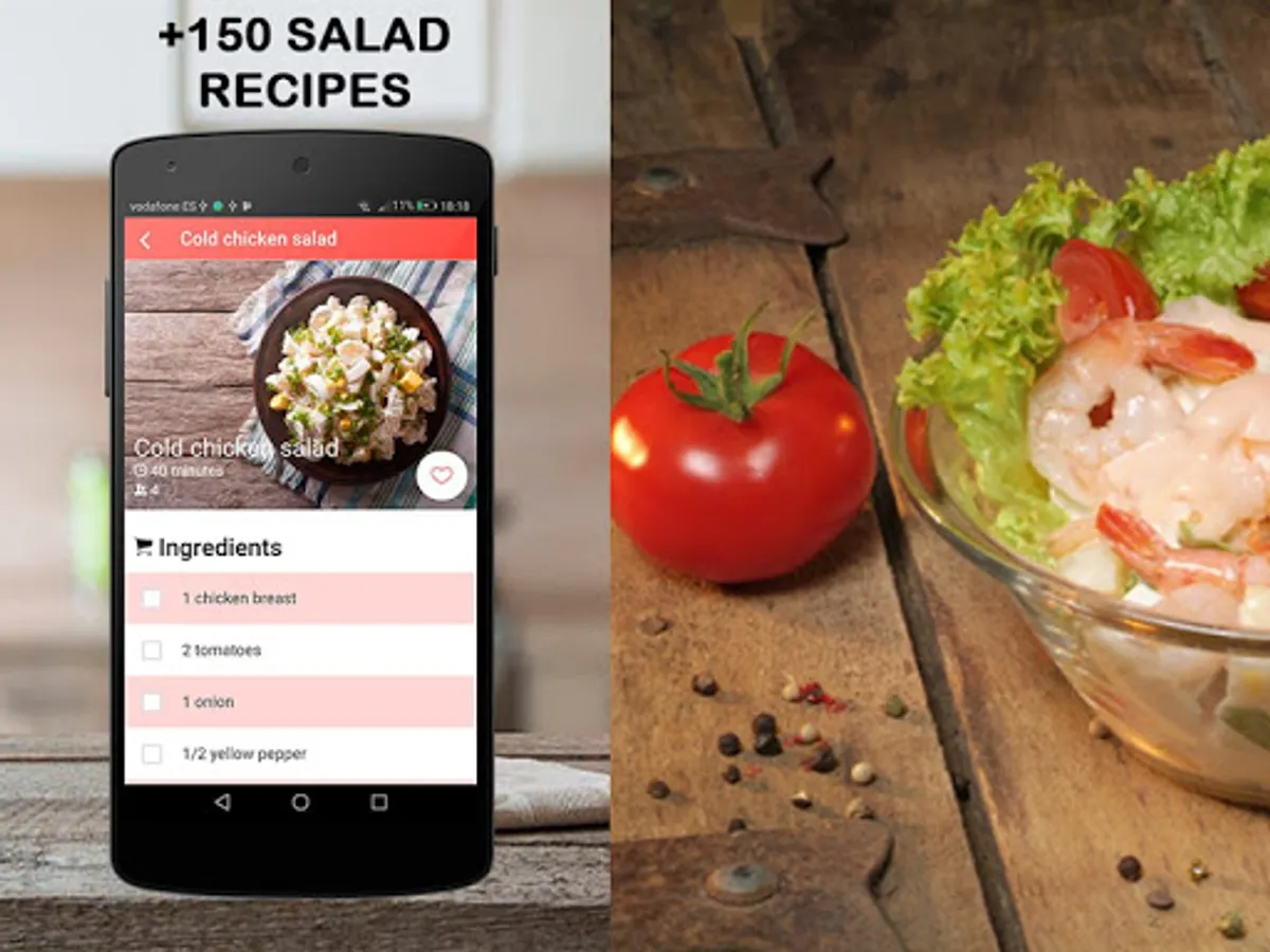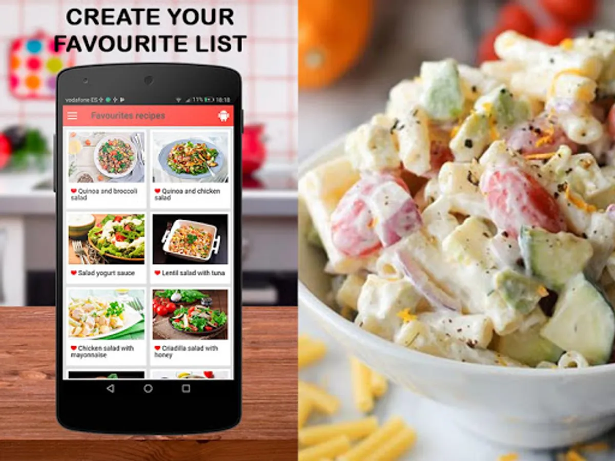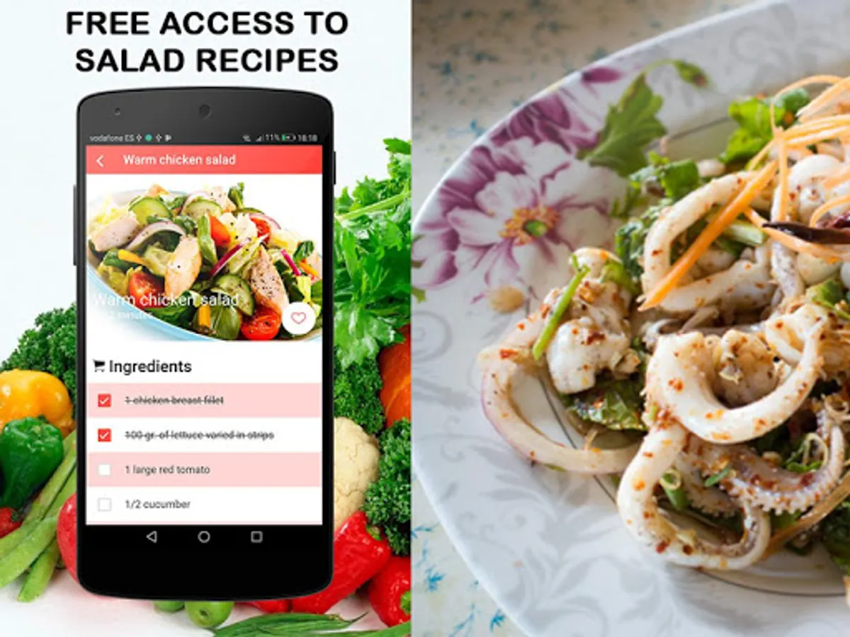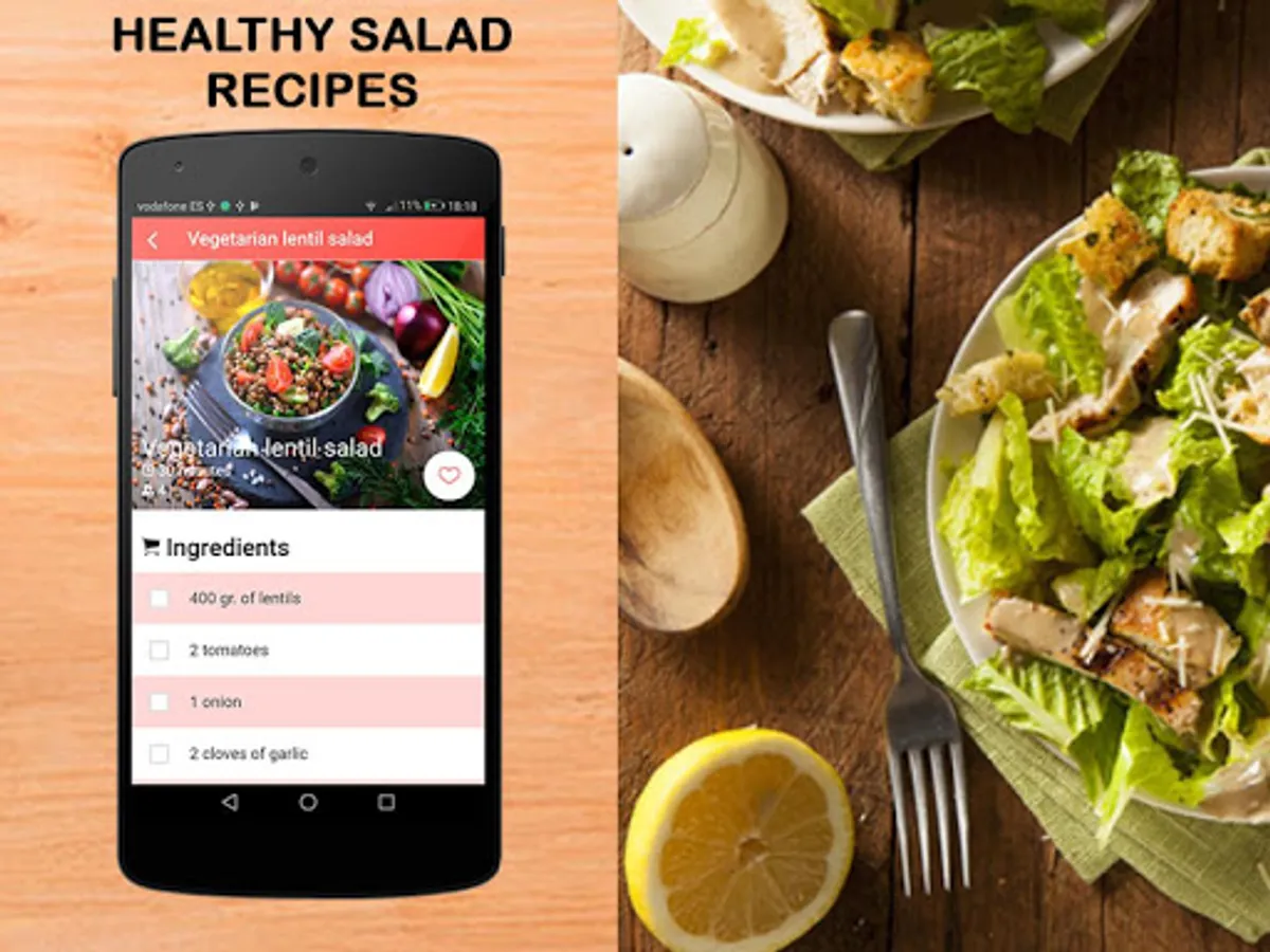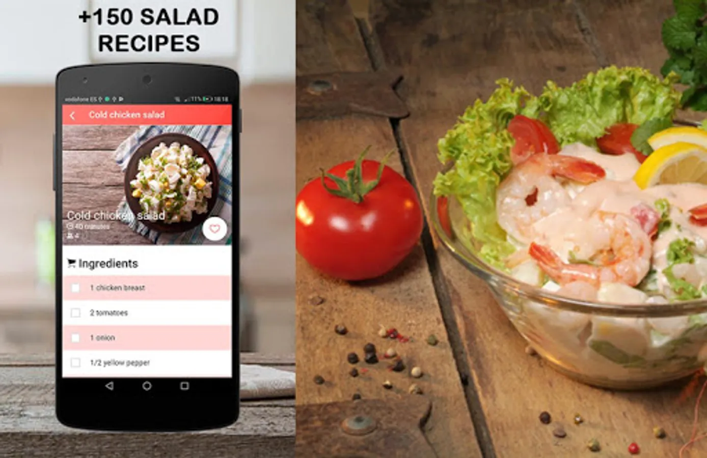 More than 150 salad recipes are included in this free application. This meal is very consumed throughout the planet and is usually prepared in its classic version with different vegetables such as lettuce, arugula, tomato, spinach leaves, broccoli, onion, olives, etc. However, there are different varieties in which you can add many type of ingredient: Meats such as chicken, duck or turkey, fish such as tuna, anchovies, cod or salmon, fruits such as apple or pineapple, different varieties of cheese, different types of sauces as caesar salad, olives, avocado, sweet corn, potatoes, pasta, boiled eggs, legumes such as lentils or chickpeas, nuts, cereals such as rice or the quinoa etc. The list as you can see is endless, so much so that we can find an infinite number of menus. Enjoy elaborations full of flavor and new ingredients, we love healthy meals!