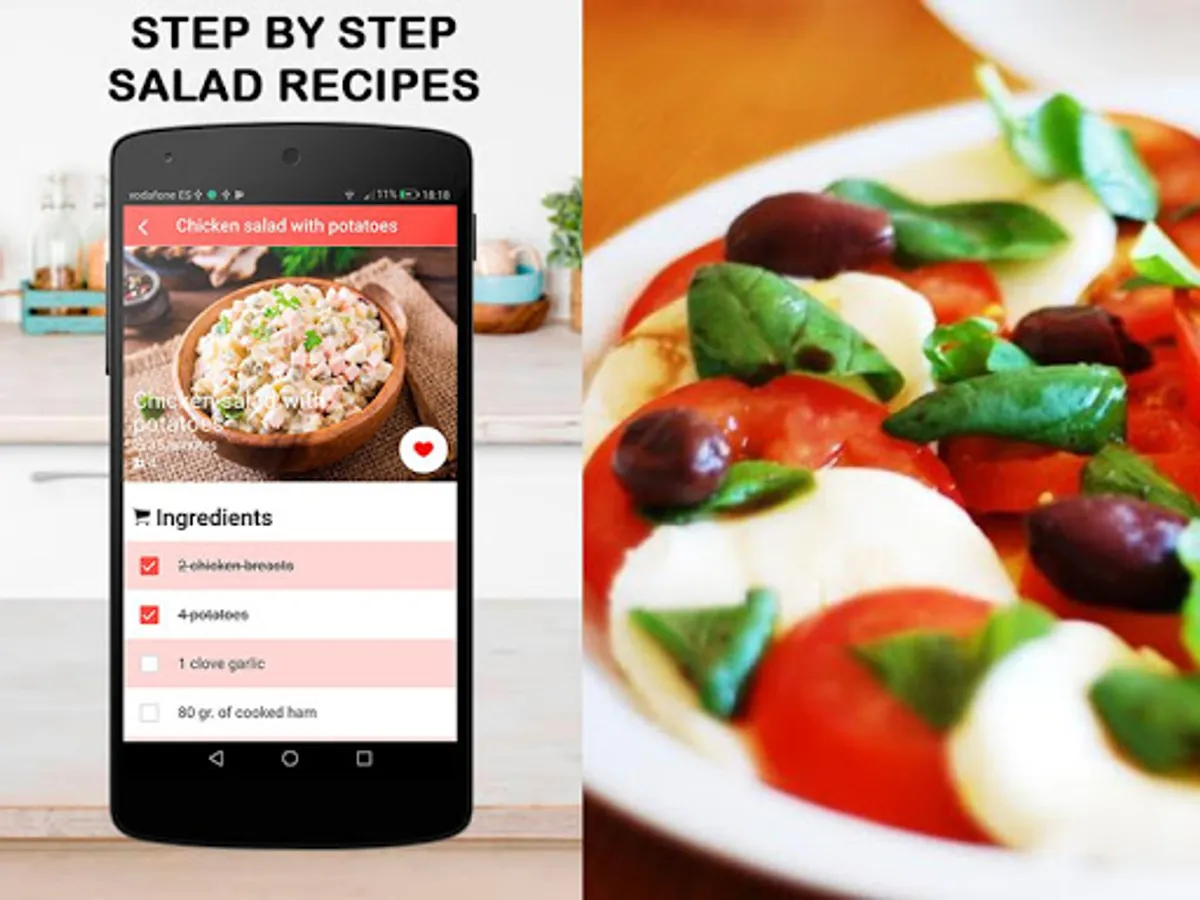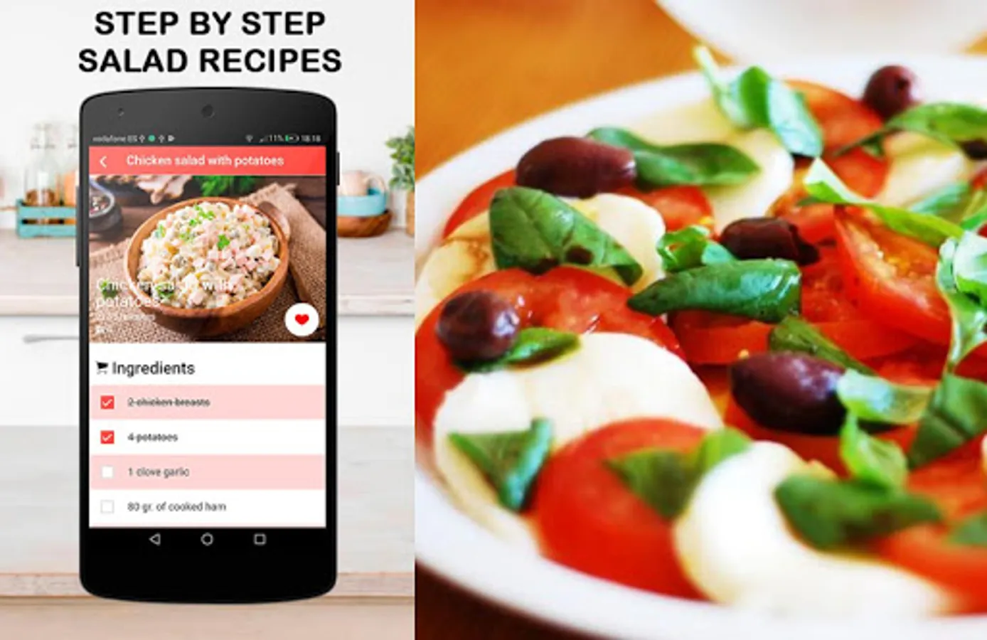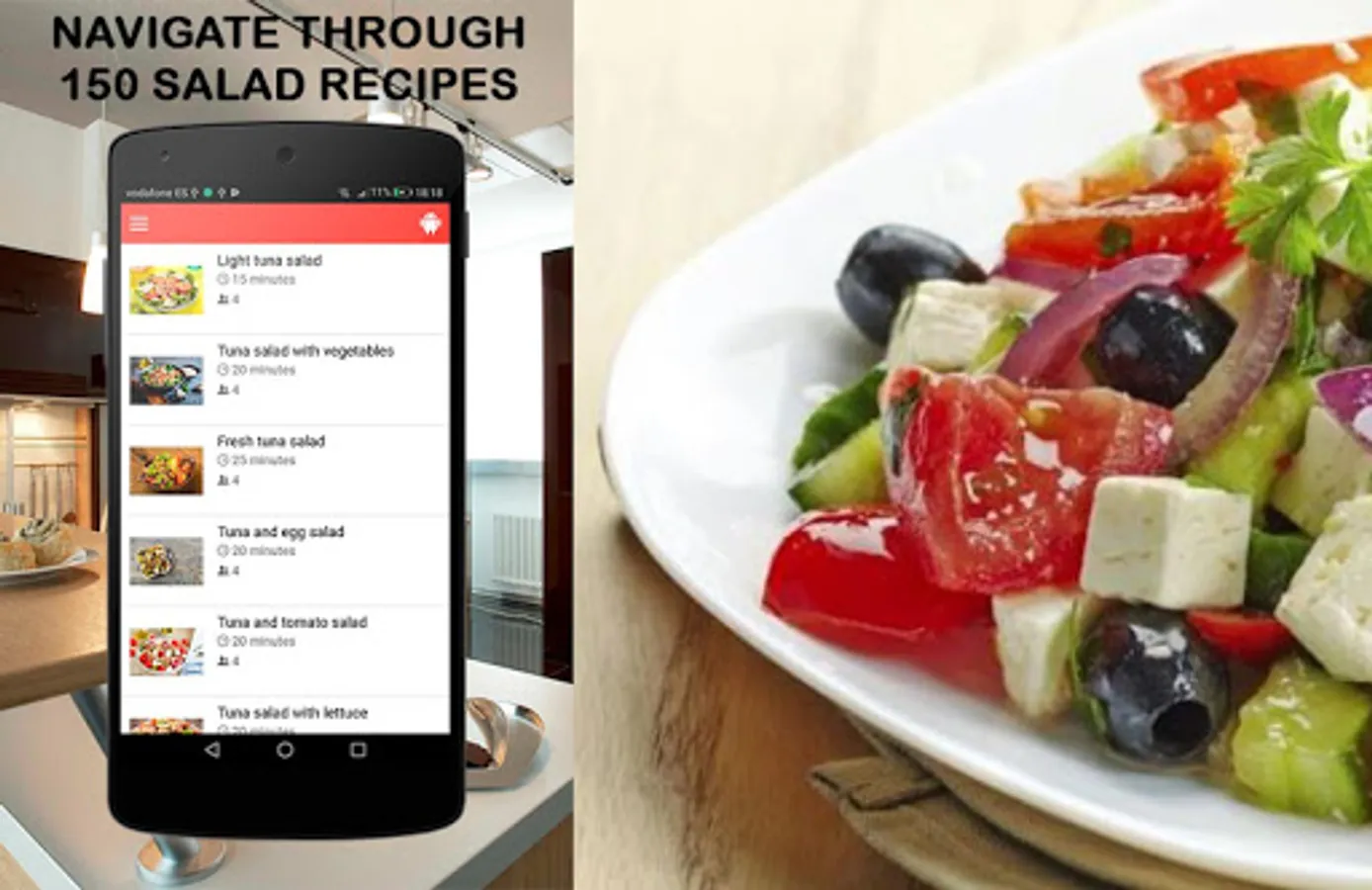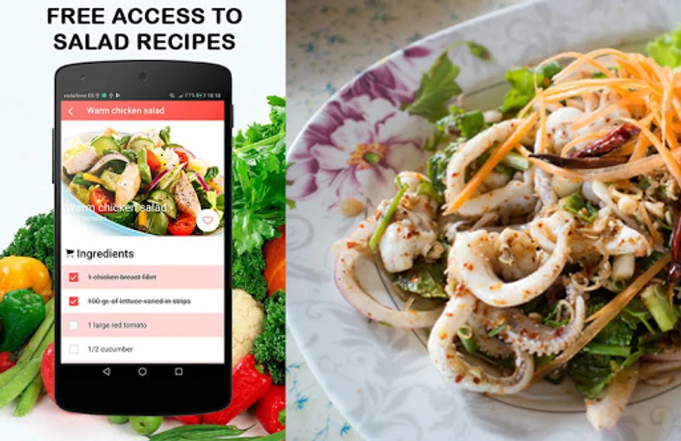 More than 150 salad recipes are included in this free application. This meal is very consumed throughout the planet and is usually prepared in its classic version with different vegetables such as lettuce, arugula, tomato, spinach leaves, broccoli, onion, olives, etc. However, there are different varieties in which you can add many type of ingredient: Meats such as chicken, duck or turkey, fish such as tuna, anchovies, cod or salmon, fruits such as apple or pineapple, different varieties of cheese, different types of sauces as caesar salad, olives, avocado, sweet corn, potatoes, pasta, boiled eggs, legumes such as lentils or chickpeas, nuts, cereals such as rice or the quinoa etc. The list as you can see is endless, so much so that we can find an infinite number of menus. Enjoy elaborations full of flavor and new ingredients, we love healthy meals!