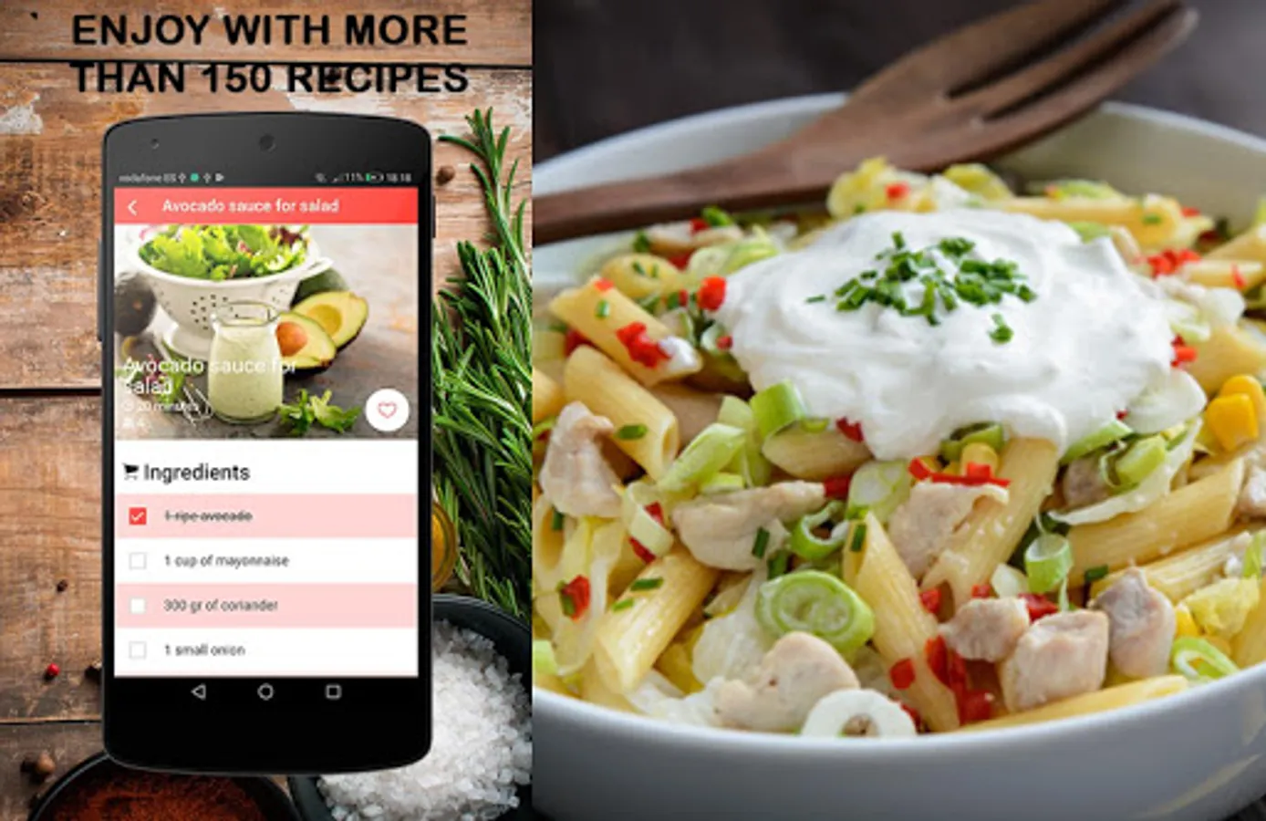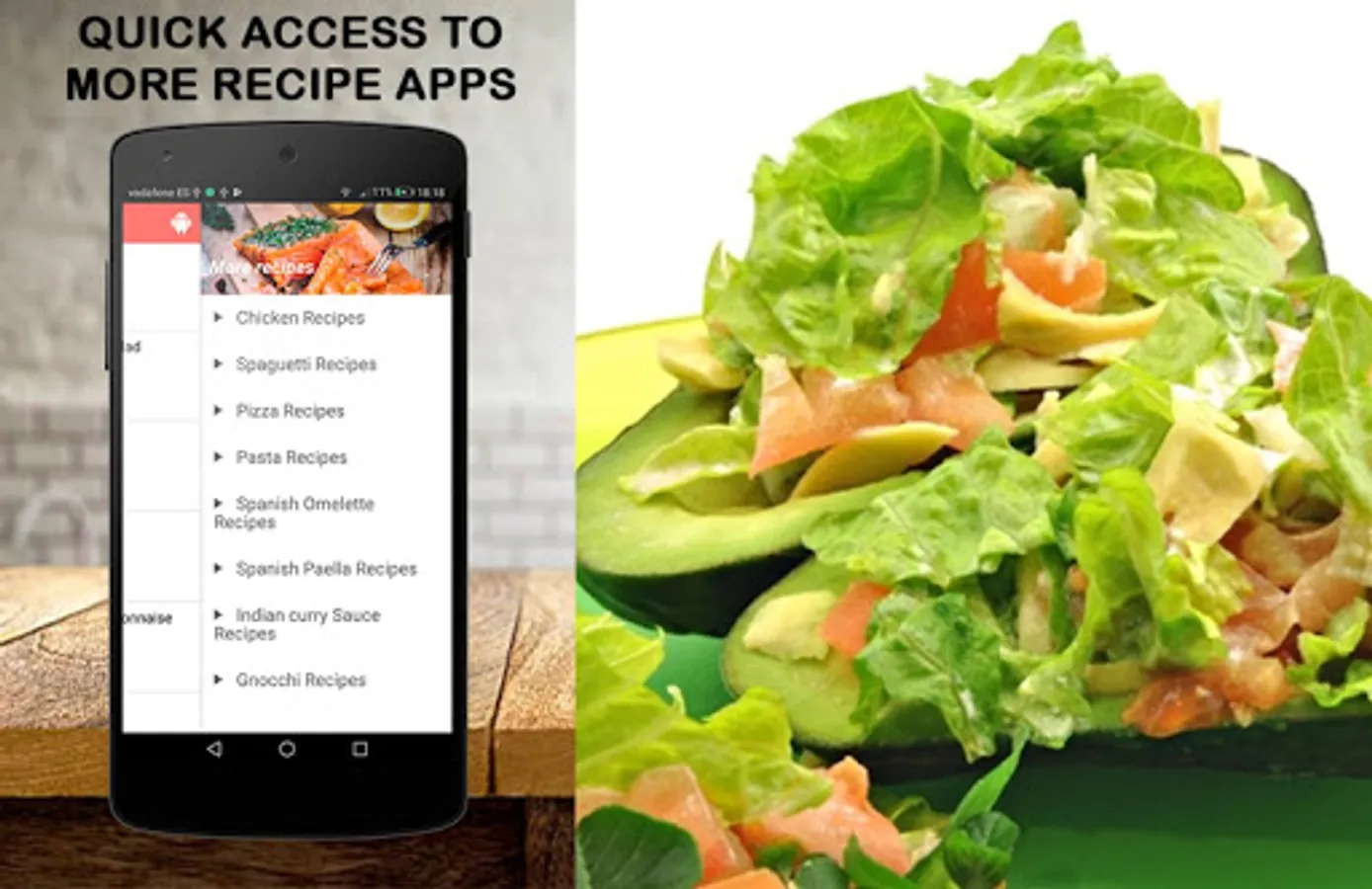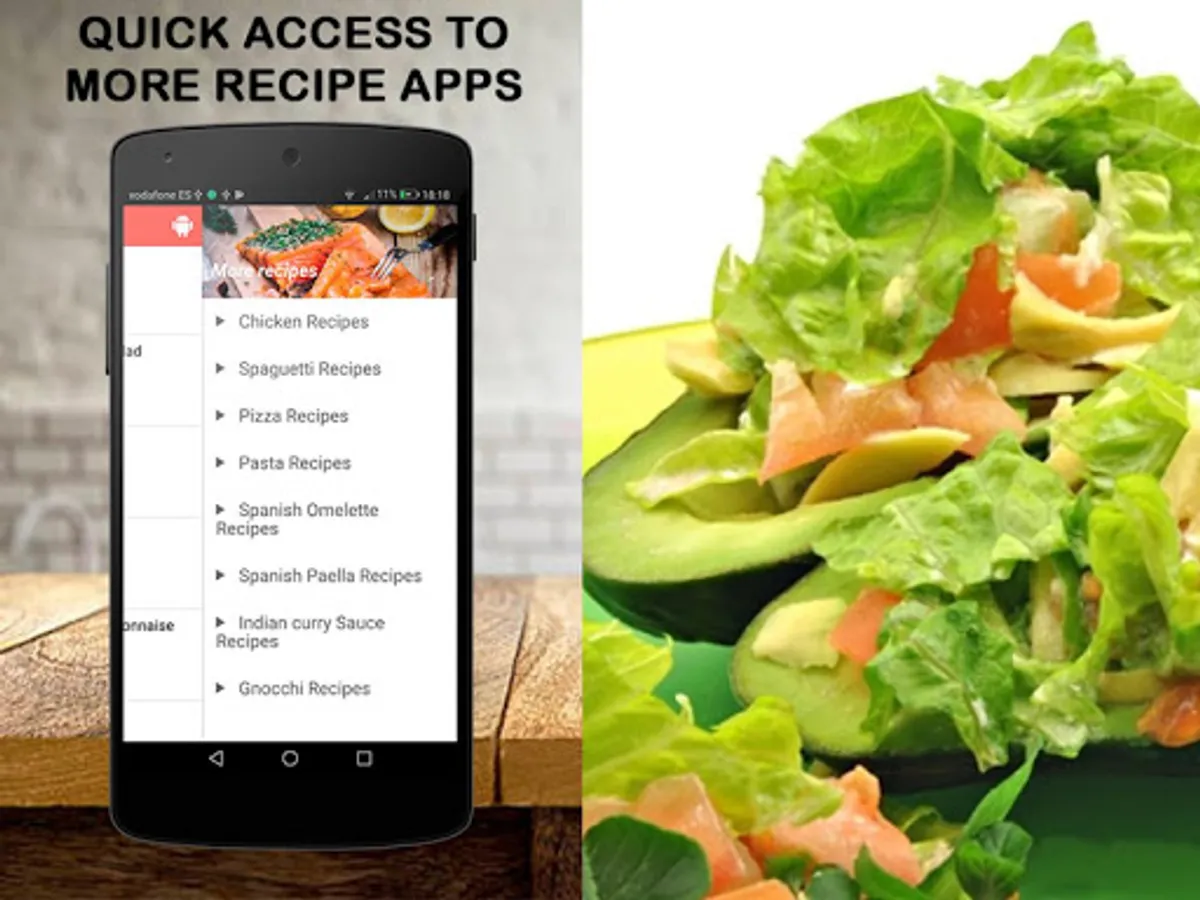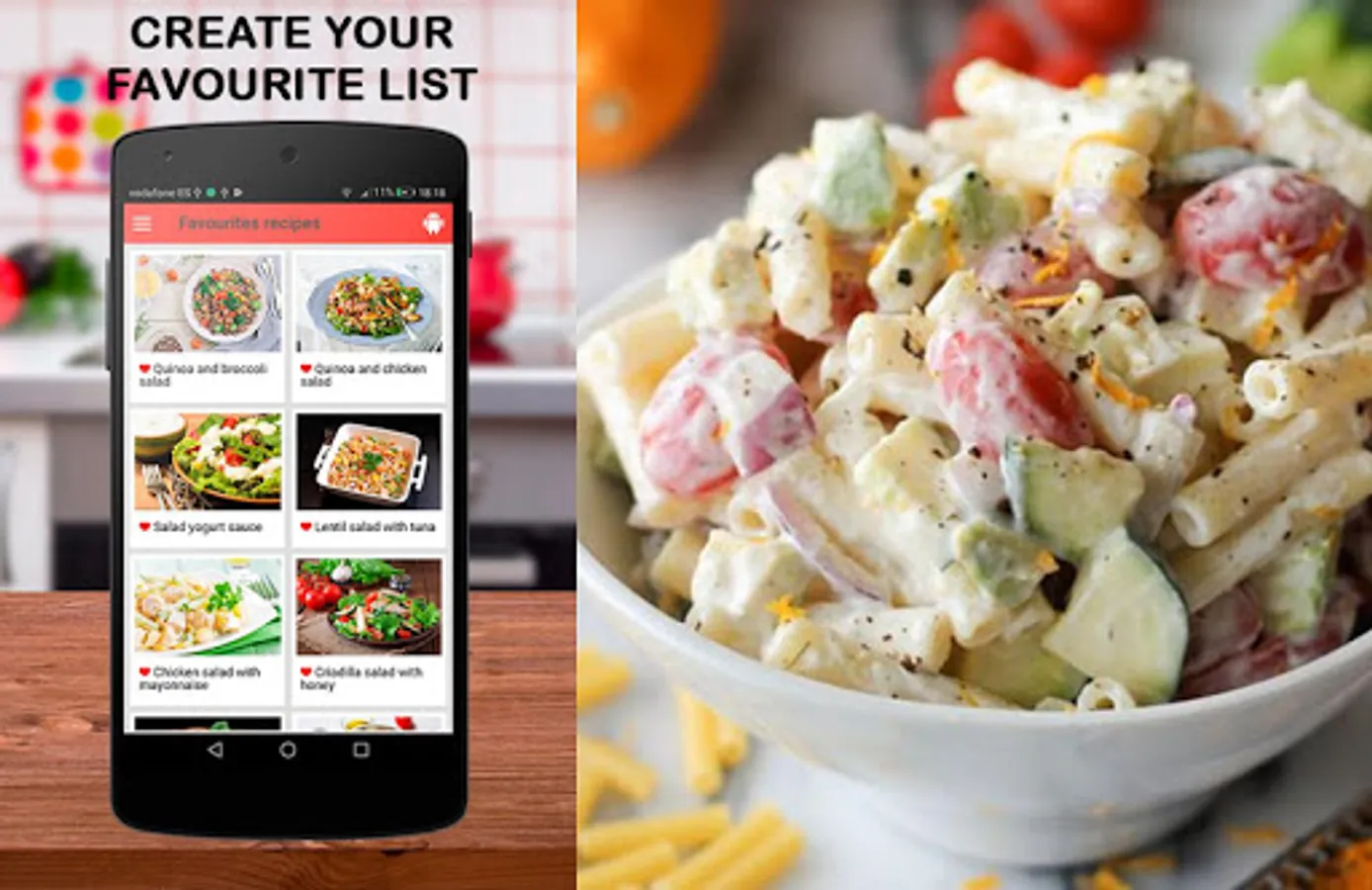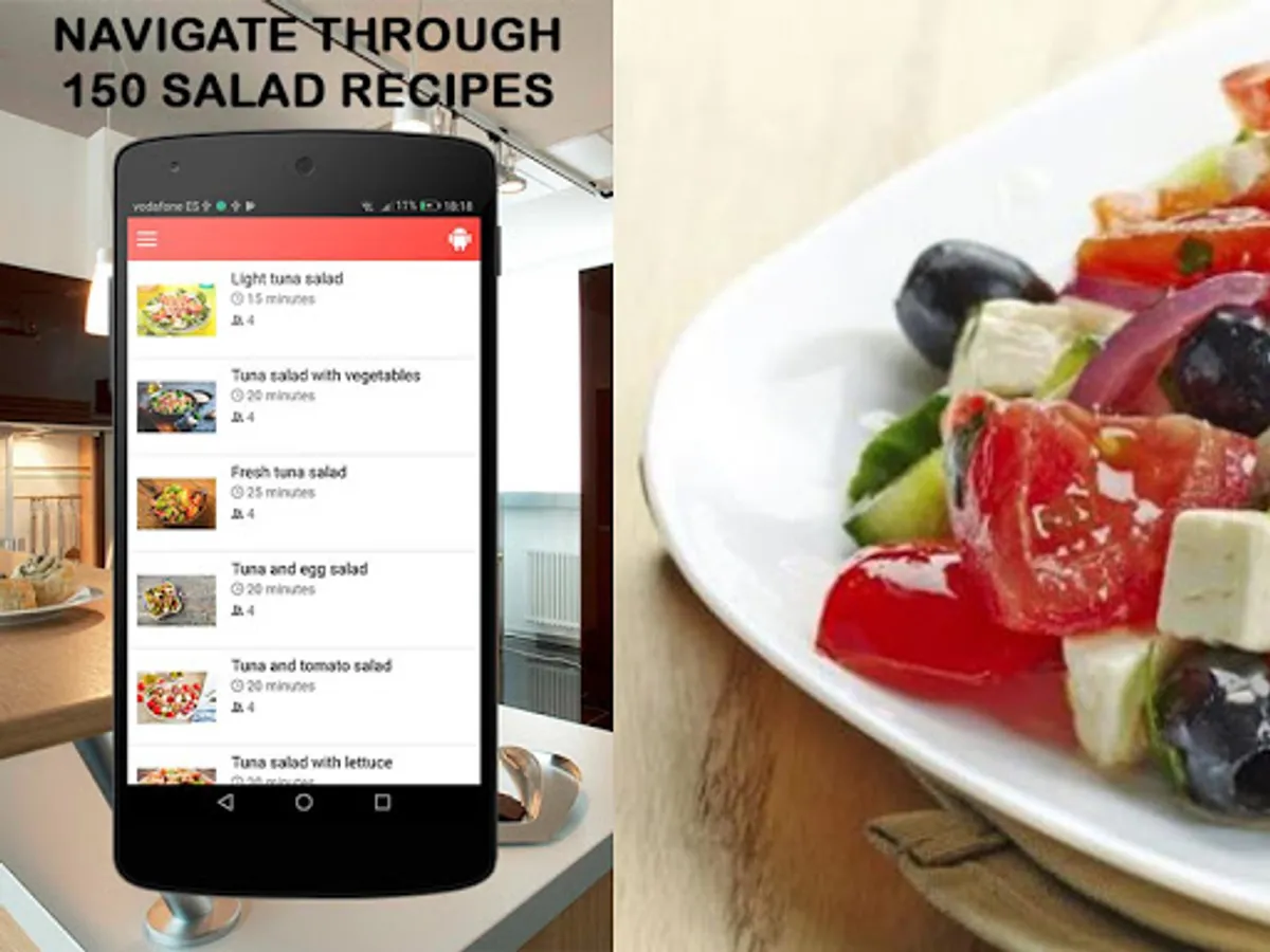 More than 150 salad recipes are included in this free application. This meal is very consumed throughout the planet and is usually prepared in its classic version with different vegetables such as lettuce, arugula, tomato, spinach leaves, broccoli, onion, olives, etc. However, there are different varieties in which you can add many type of ingredient: Meats such as chicken, duck or turkey, fish such as tuna, anchovies, cod or salmon, fruits such as apple or pineapple, different varieties of cheese, different types of sauces as caesar salad, olives, avocado, sweet corn, potatoes, pasta, boiled eggs, legumes such as lentils or chickpeas, nuts, cereals such as rice or the quinoa etc. The list as you can see is endless, so much so that we can find an infinite number of menus. Enjoy elaborations full of flavor and new ingredients, we love healthy meals!