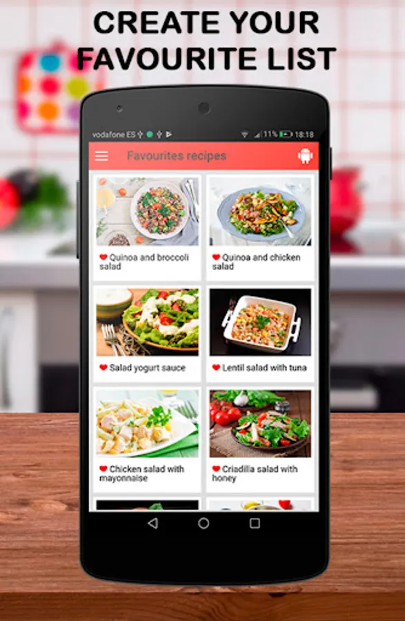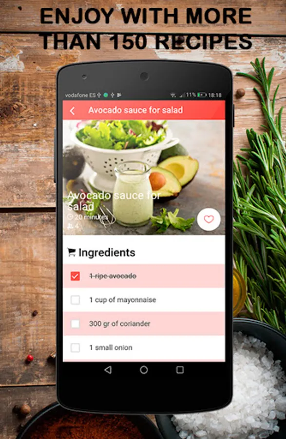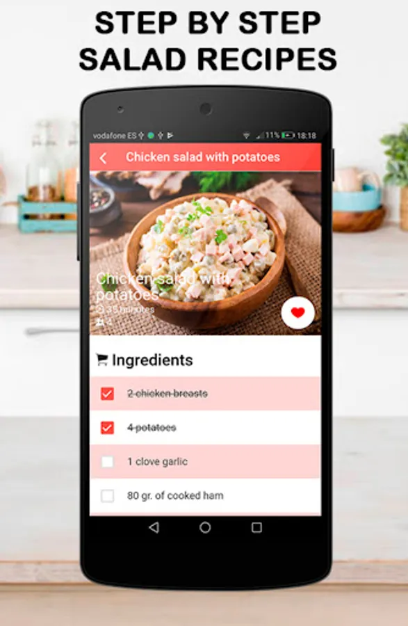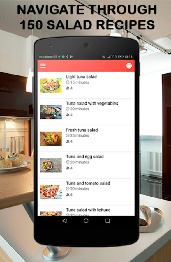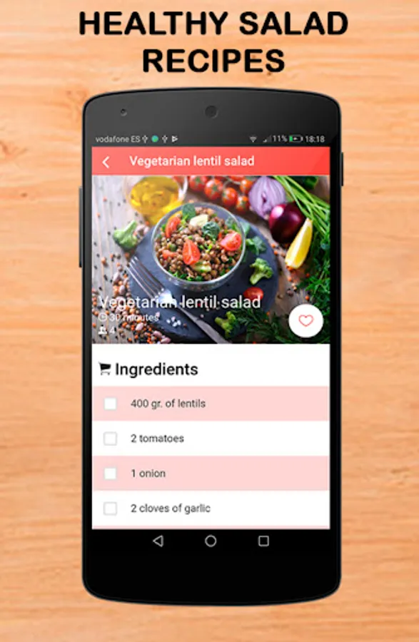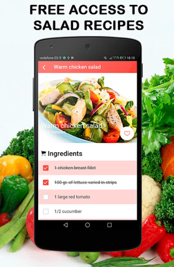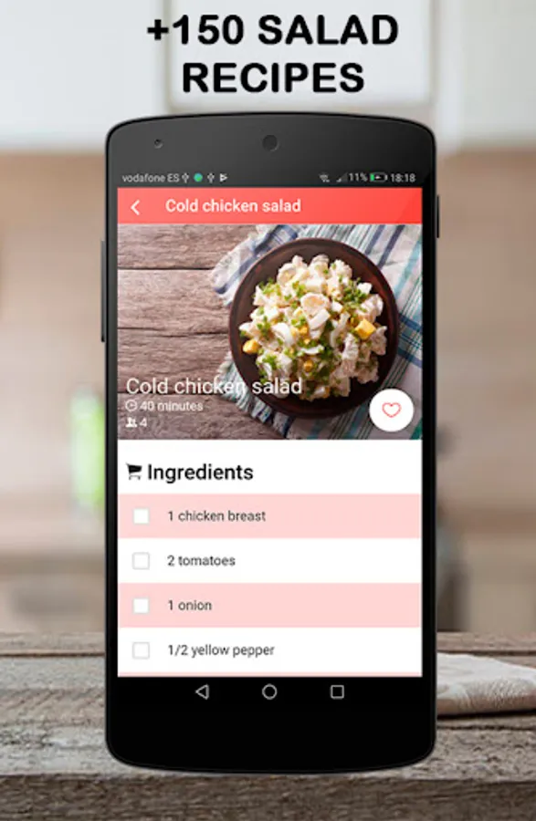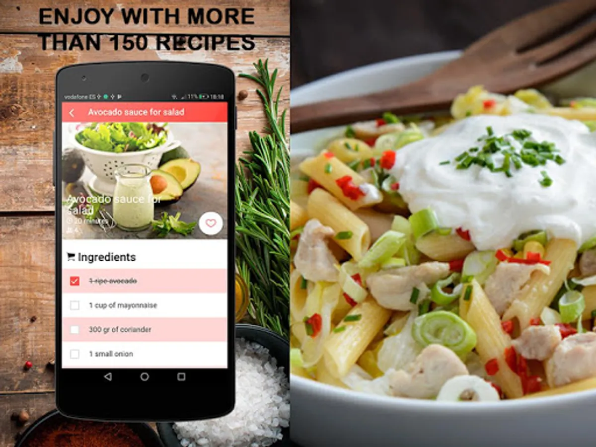 More than 150 salad recipes are included in this free application. This meal is very consumed throughout the planet and is usually prepared in its classic version with different vegetables such as lettuce, arugula, tomato, spinach leaves, broccoli, onion, olives, etc. However, there are different varieties in which you can add many type of ingredient: Meats such as chicken, duck or turkey, fish such as tuna, anchovies, cod or salmon, fruits such as apple or pineapple, different varieties of cheese, different types of sauces as caesar salad, olives, avocado, sweet corn, potatoes, pasta, boiled eggs, legumes such as lentils or chickpeas, nuts, cereals such as rice or the quinoa etc. The list as you can see is endless, so much so that we can find an infinite number of menus. Enjoy elaborations full of flavor and new ingredients, we love healthy meals!