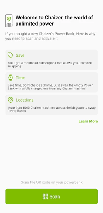 - Scan QR code on the Chaizer station to collect your power bank. Pay only for the rental duration.
