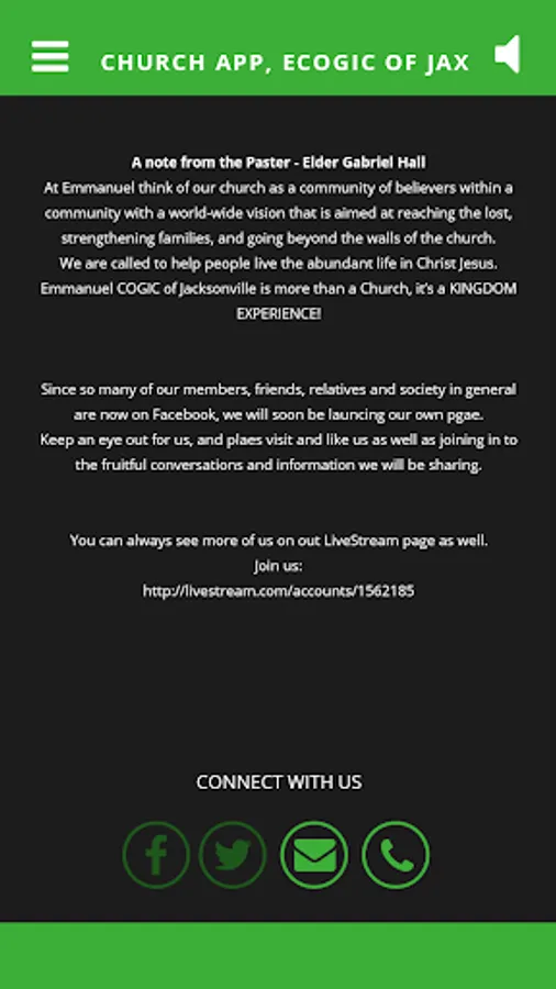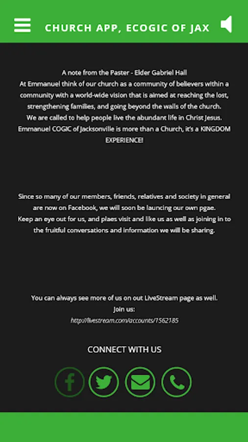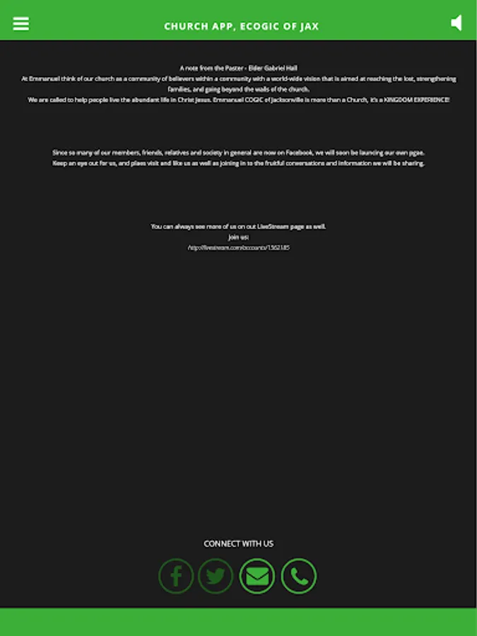 The Emmanuel Emmanuel COGIC app is your place to learn everything about our fellowship and ministry. You can hear sermons, get to our Live-Streamâ„¢ broadcast and keep up to date. We will also push updates and relevant content from time to time.