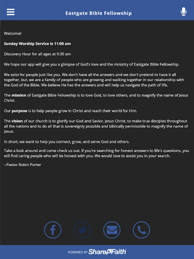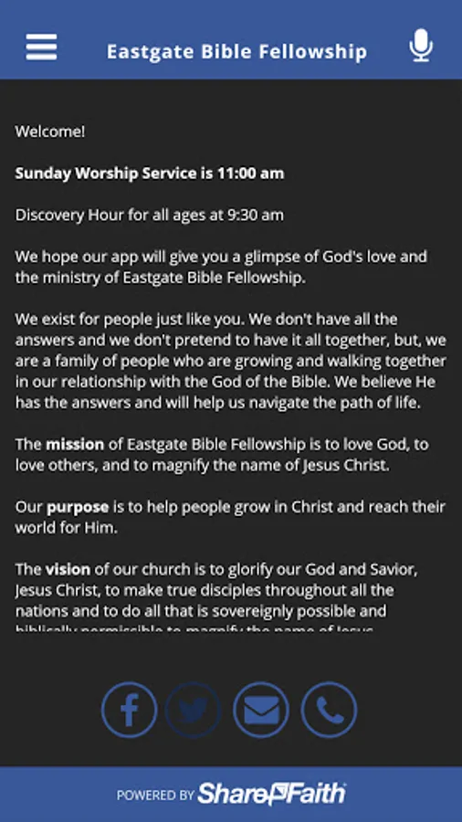This app will help you connect with the ministry of Eastgate Bible Fellowship in Bellevue, WA. Stay up to date with our Calendar, Watch Sermons, Prayer Requests and several other things.