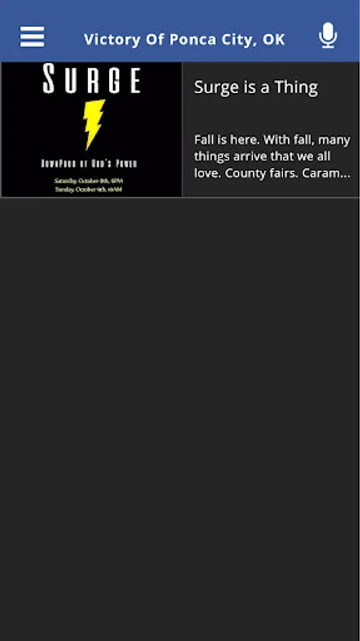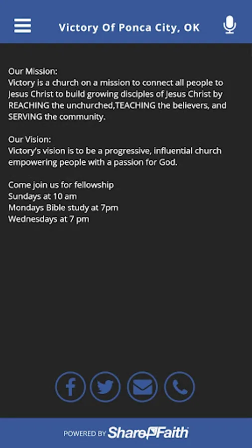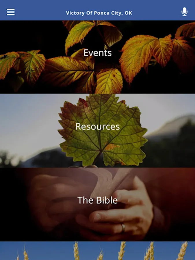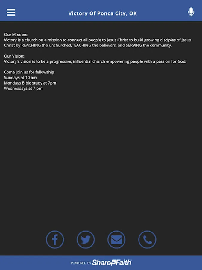 This app connects people to Victory Worship Center, Ponca City, OK church activities and information.