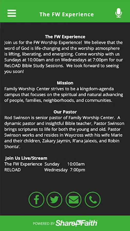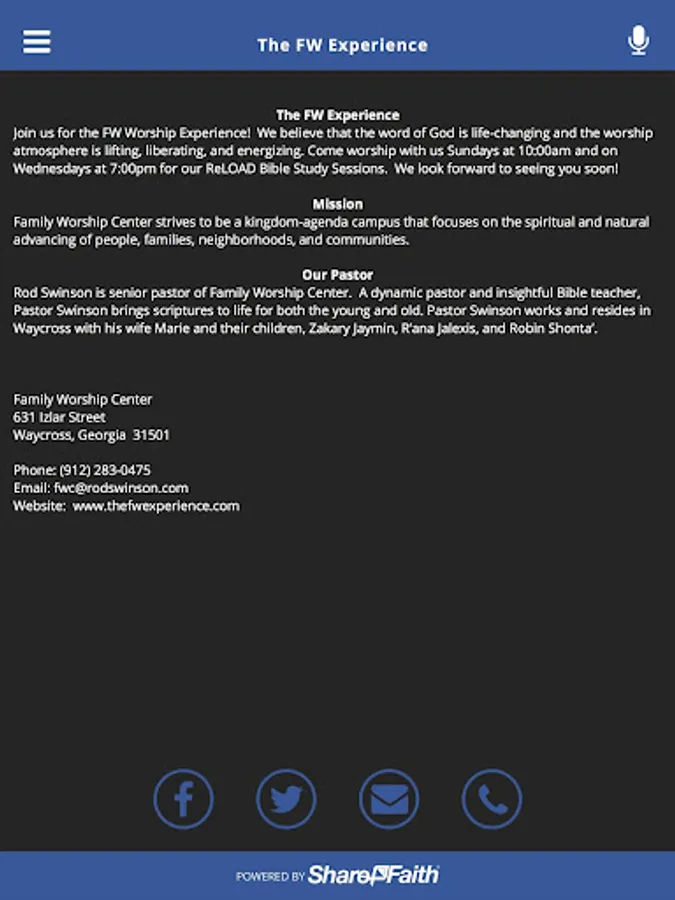 Download the official Family Worship Center Waycross Georgia app to stay up-to-date with the latest events, newest sermons, and all the happenings at FWC. Join us anytime your in the South Georgia area!