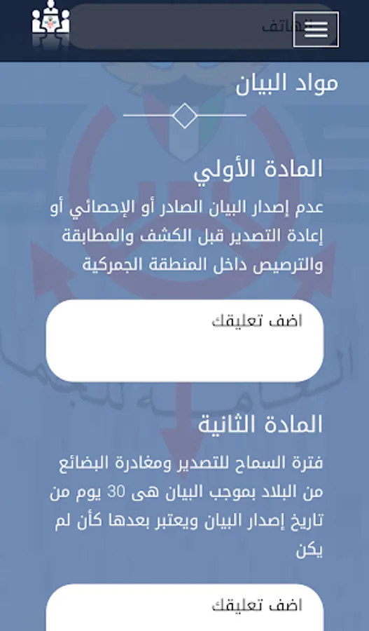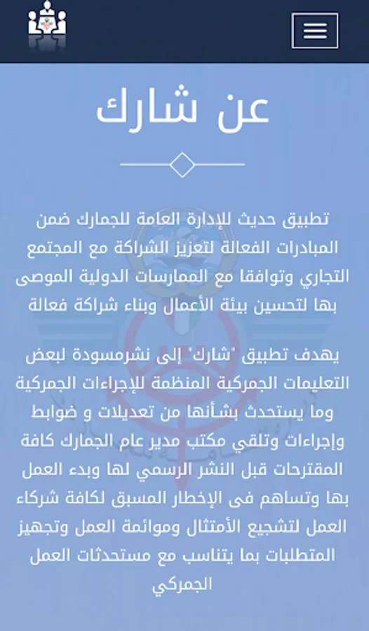 Application aims "participated" to Nschermsudh some Customs Regulations Customs Organization procedures and introduce them amendments and controls and procedures and to receive the Office of Director General of Customs of all proposals before the official publication of her and start working out and contribute to the advance notice of all business partners to encourage compliance and harmonization of working and processing requirements commensurate with the work of customs innovations