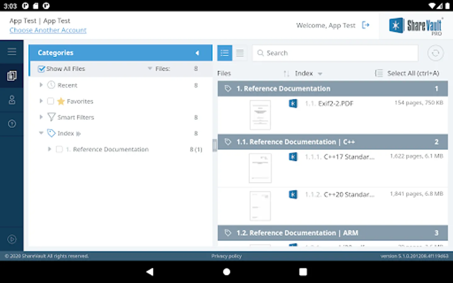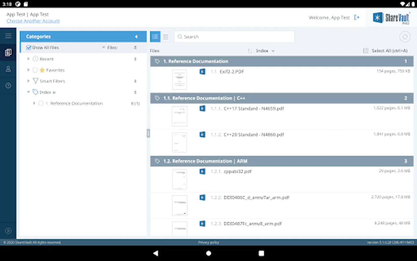 • Optimized for device screen size: On tablets, the application takes advantage of the device's larger screen size by including the full ShareVault functionality, including a split screen category pane and file list with thumbnails, for improved user experience. On phones, the app downgrades elegantly to fit the reduced screen size of smaller devices by eliminating the split screen display, thumbnails, Q&A and much of administrator functionality available on tablets.