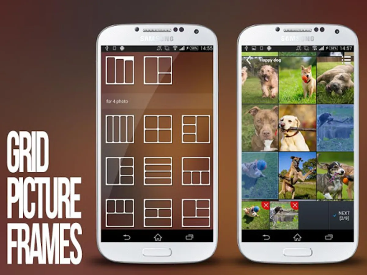 "Grid Picture Frames" offers photo grid styles with more than 200 grid styles with 1 to 9 slots photo
