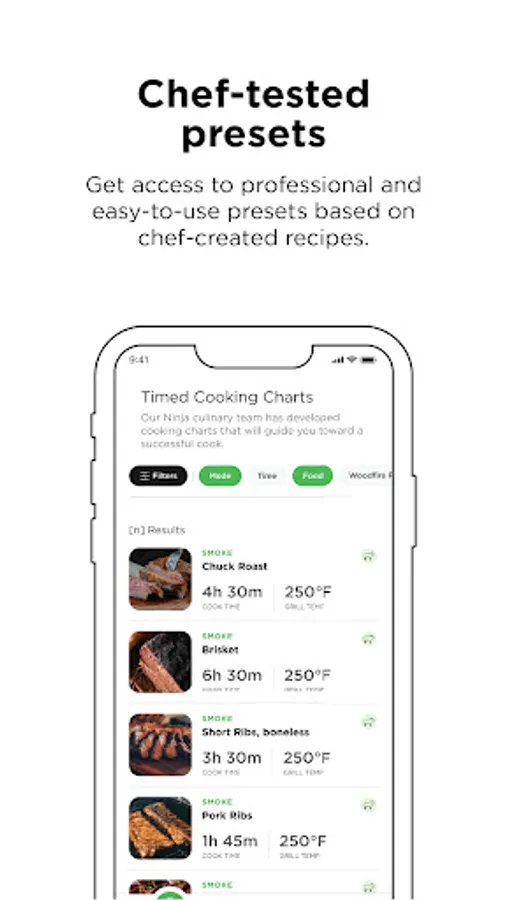 • Easy-to-use cooking charts: Easily get the perfect cook—just search for your protein and get chef-recommended settings for each cooking function. Filter by food, mode, and length of time.