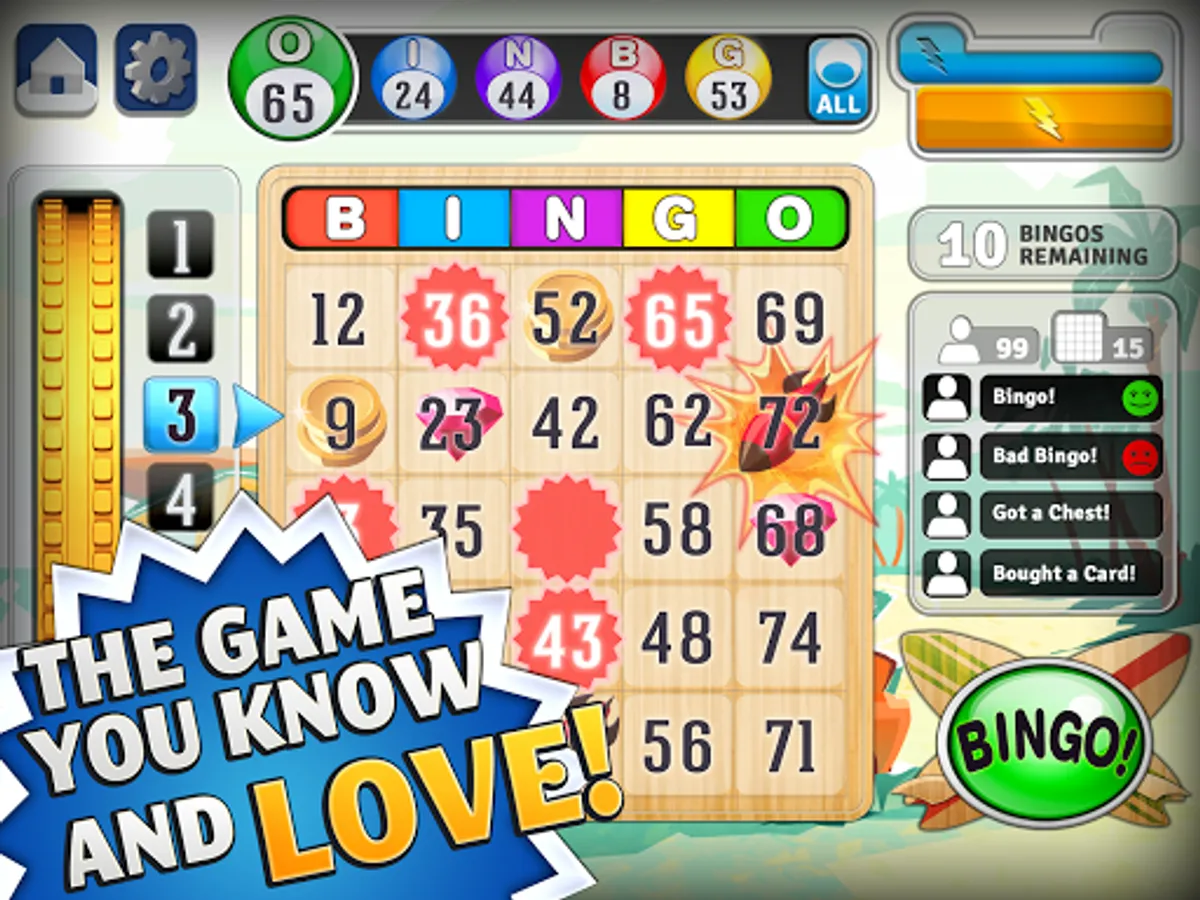 Play Bingo™ like never before! Play with your friends and use unique boosts for awesome effects like free daubs, extra coins and more! Every game grants rewards to level up and unlock new rooms! More cards than any other Bingo game! Slick controls let you easily switch between cards, daub called numbers and call out Bingo as soon as you have it! Do you have what it takes to play up to 8 or 12 cards at once? Find out now with Bingo™!