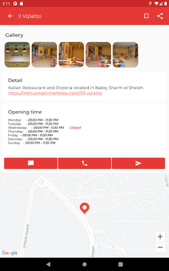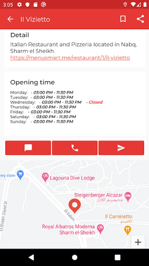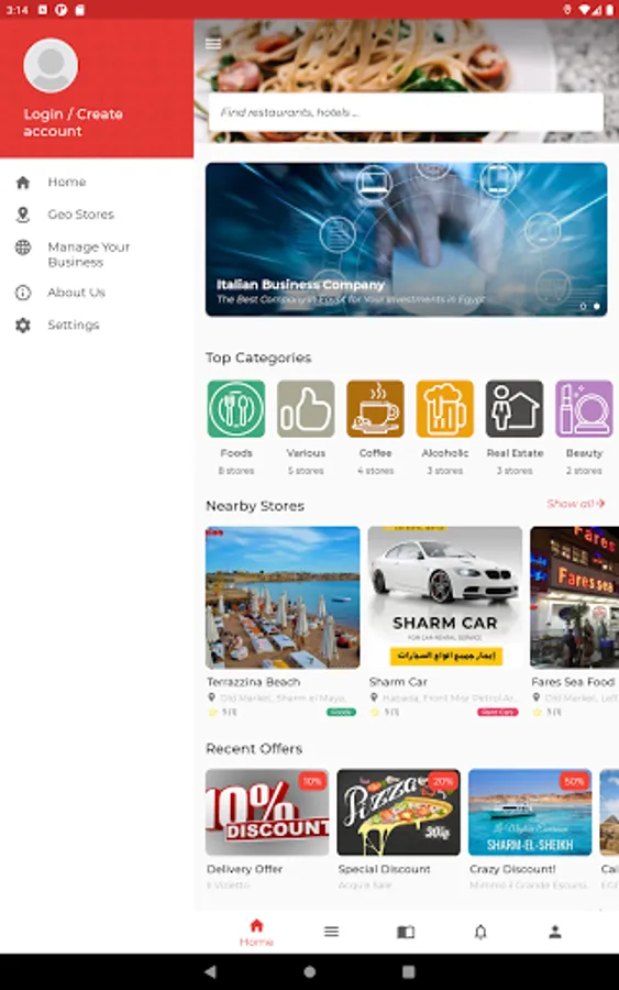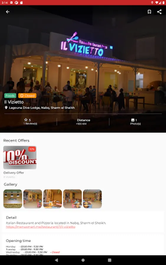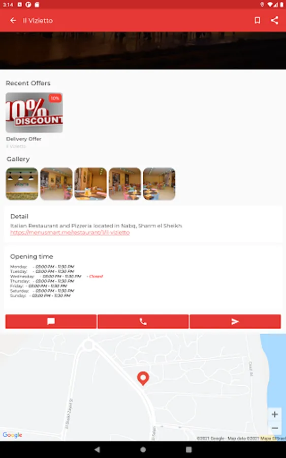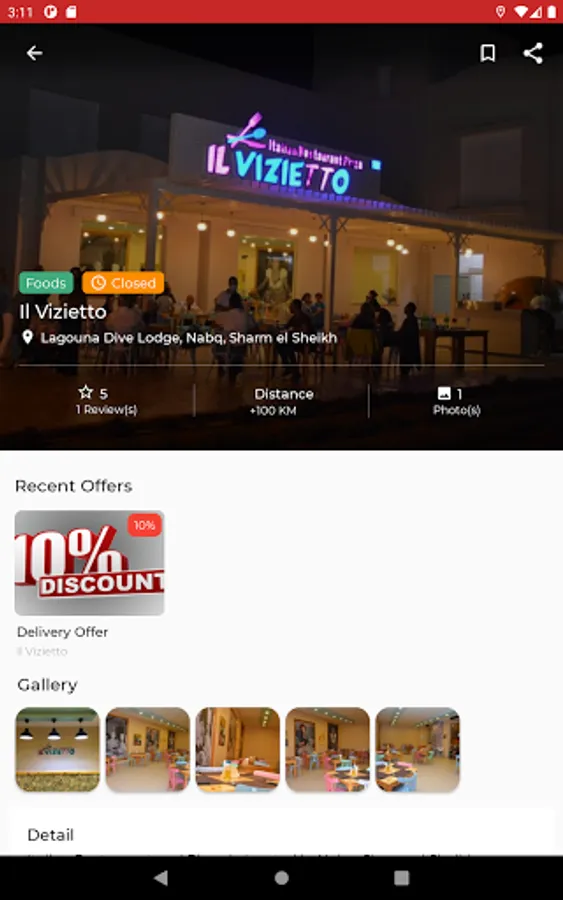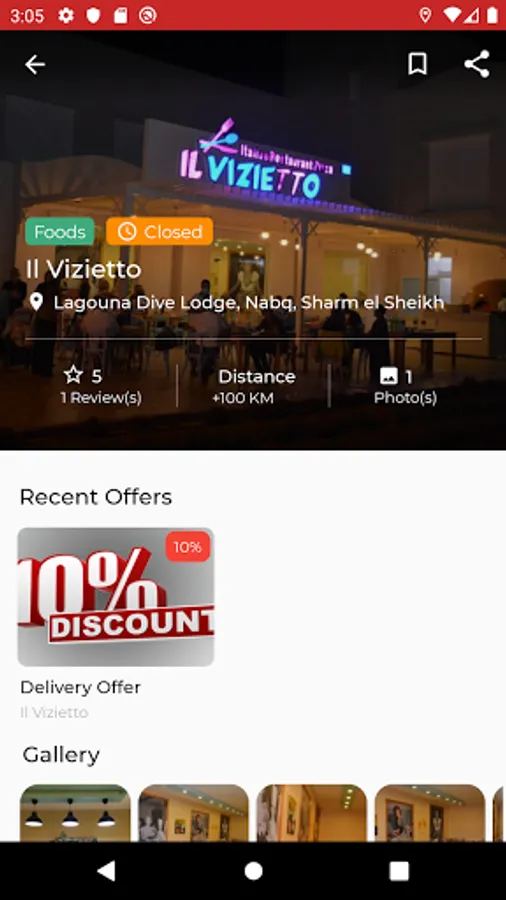It helps you to discover different points of interests in Sharm el Sheikh, such as Supermarket, Hotels, Hospitals, Shopping malls, Restaurants, Coffee Shop and entertainment places, see their reviews, check their images,and their Offers, call their contact numbers and set the route map to desired point.