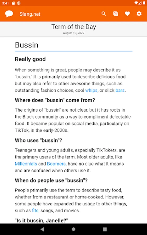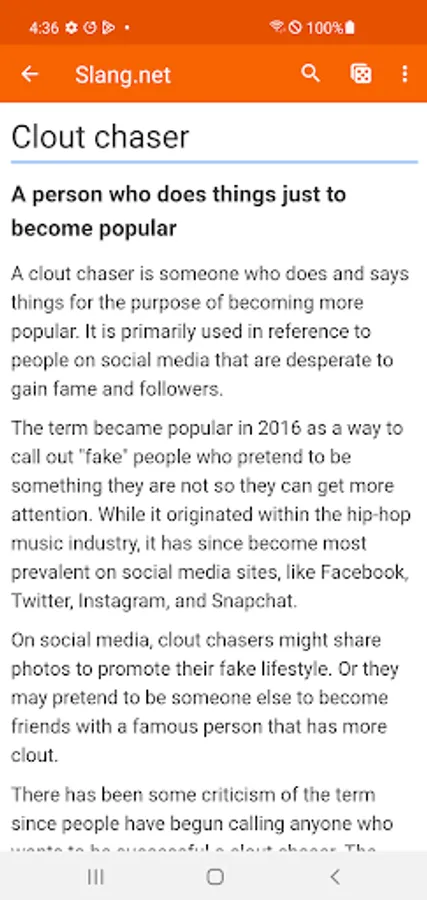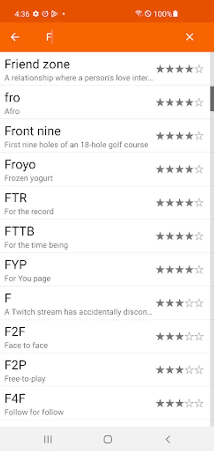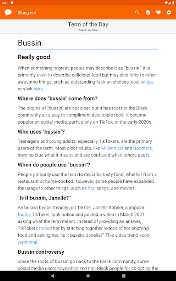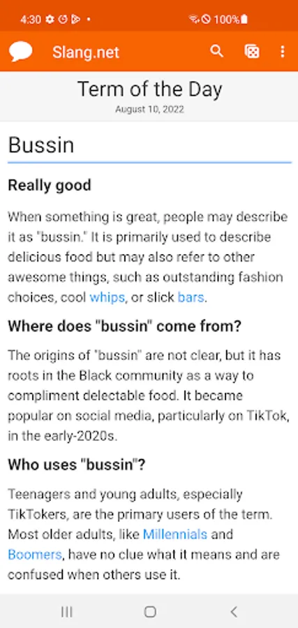 The Slang Dictionary is a free app that allows you to look up thousands of slang terms. Search for the meanings of acronyms, abbreviations, and slang terms. Each term includes a popularity ranking and information about how it is used.
