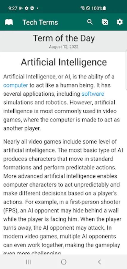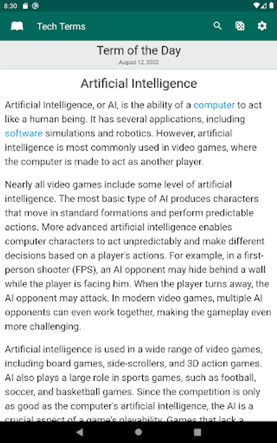The goal of the Tech Terms Computer Dictionary is to make computer terminology easy to understand. Definitions are written clearly and concisely and often provide real-life examples of how the terms are used. You can search and browse through the entire dictionary, save favorites, and come back each day to read the daily definition.