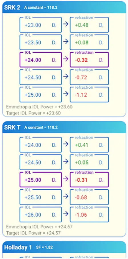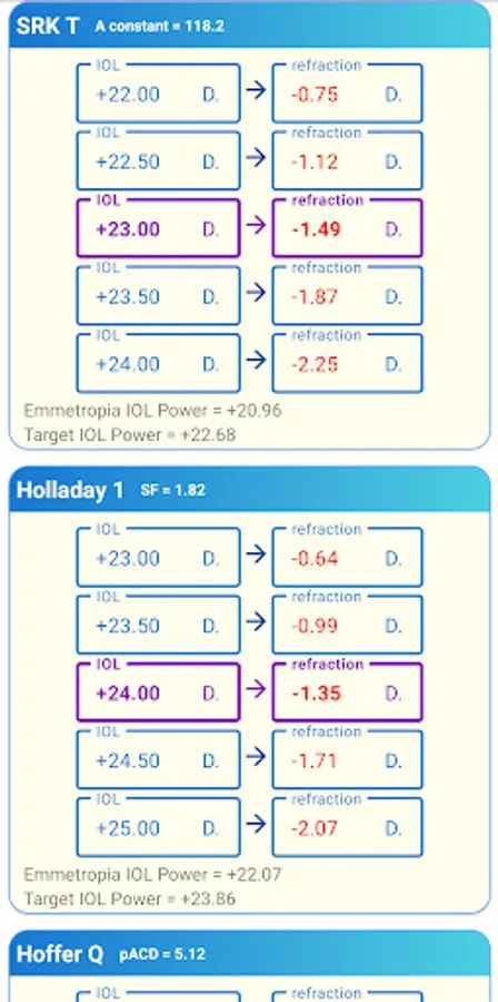 With PREMIUM Plan you can get full analysis of IOL power for any target refraction and calculate Surgeon Factor (SF) and Personalized ACD (pACD) for any case.