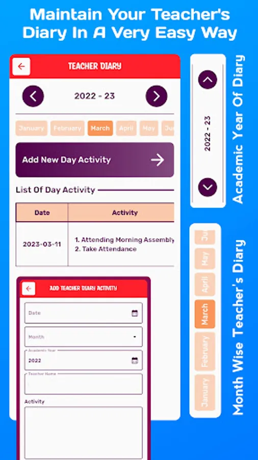 5. Teacher’s Diary :- For every teacher, a Teacher's diary is a very important thing. So, here in School Data Manager (Assam), our respected teachers can write and maintain a teacher's diary in govt provided format in a very easy way and can view their Diary of the entire year at their fingertips anytime, anywhere.