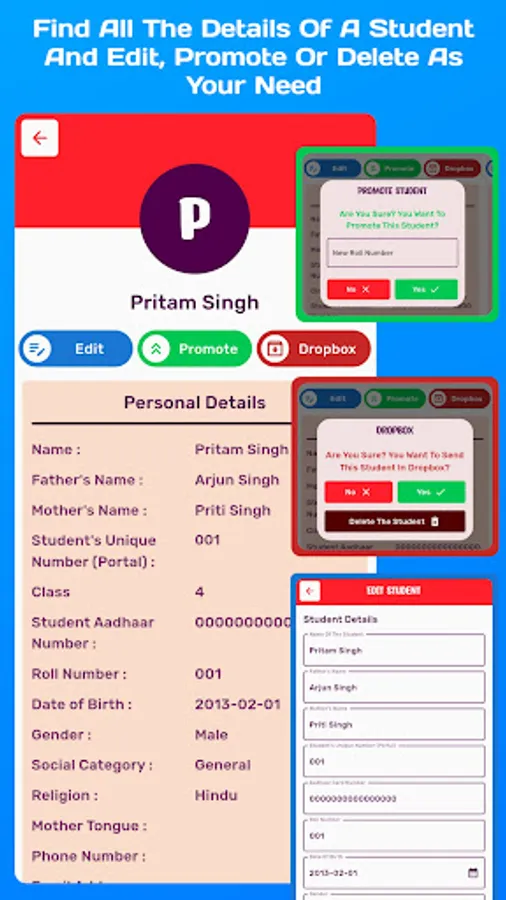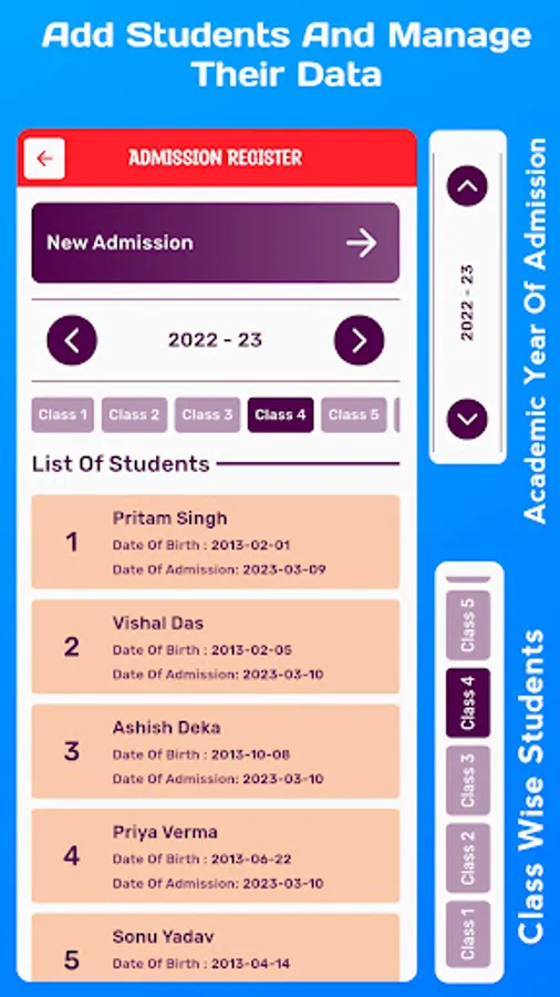 2. Student Admission Register :- By maintaining this register in School Data Manager (Assam), our respected teachers can find each and every data like father and mother's name, Date of Birth, Date of Admission, Admission number, Mobile number etc. of any student of any class in a very easy way at their fingertips anytime, anywhere.
