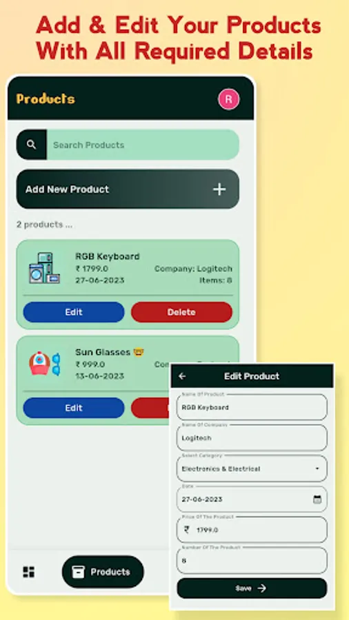 Add, Edit, Manage, and Save all of your items and products' stock positions, as well as Generate, Save, and Share your Bills with your customers, in a very easy way.