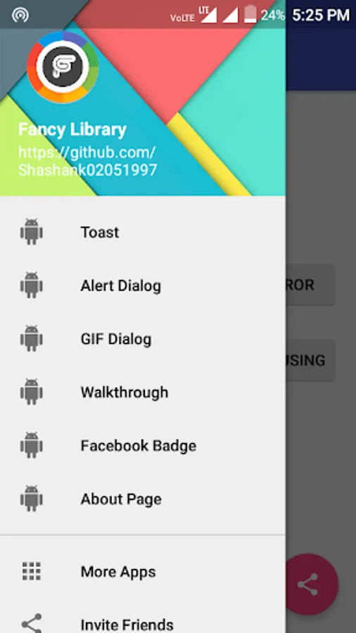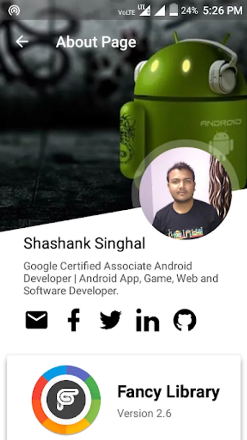 Fancy About Page is a simple and lightweight library that helps you to create cool and beautiful about page for your apps without writing dozens of lines of code. It's a material-design about screen to use on your Android apps. A developer profile and application information easy to integrate.