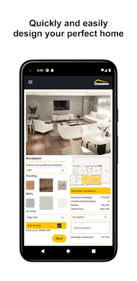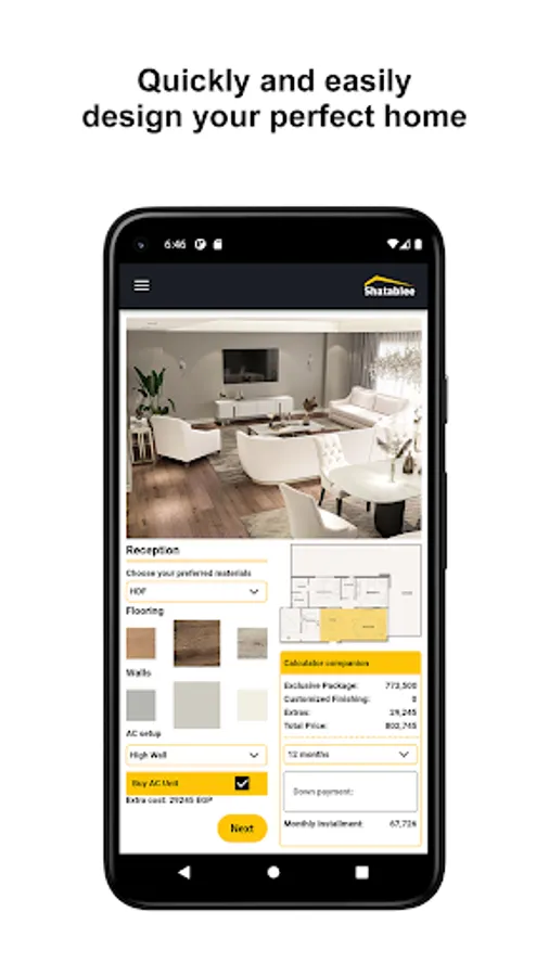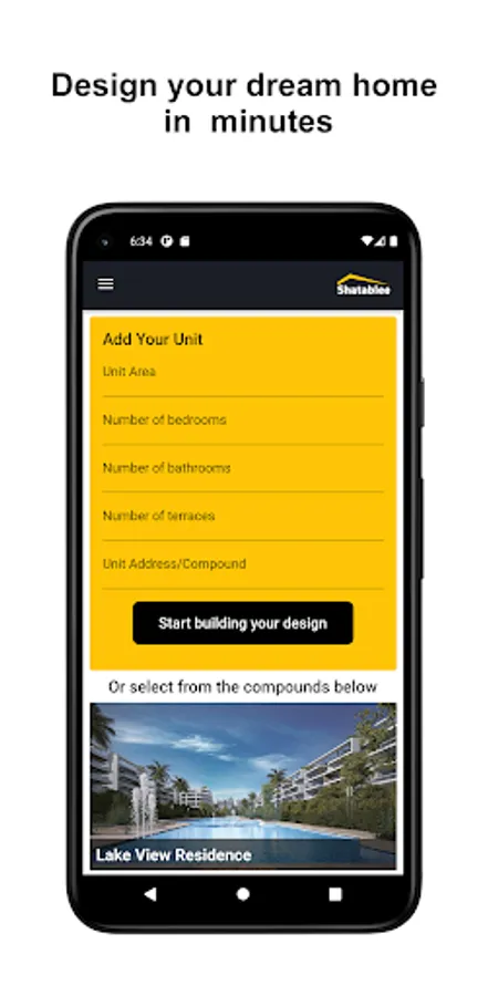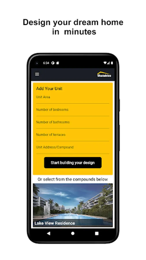 Introducing Shatablee, the easiest and fastest way to design your dream home! With our intuitive app, you can create your ideal home in just 30 minutes. And once you're happy with your design, we'll take care of all the finishing touches and have your home ready in just 90 days. Download Shatablee now and start building your dream home today!