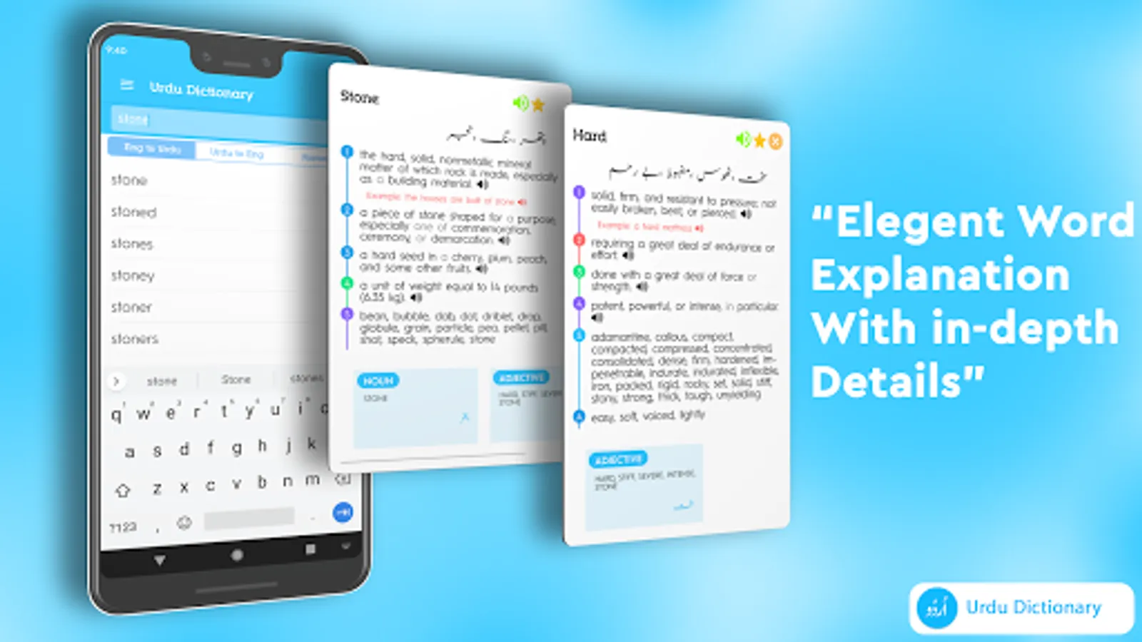 English and Urdu Dictionary is not only an Urdu Dictionary offline but also a learning tool. You can use this English dictionary app when you have no internet connection. There is auto suggestion so you need not type full words. You also can use Speech to text feature. When you start typing, you will see some words starting with the letters you typed. The Urdu dictionary app searches in a database for the matching words. Also, this App (English Urdu dictionary) provide definitions, synonyms, antonyms and related words.
