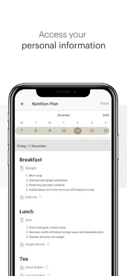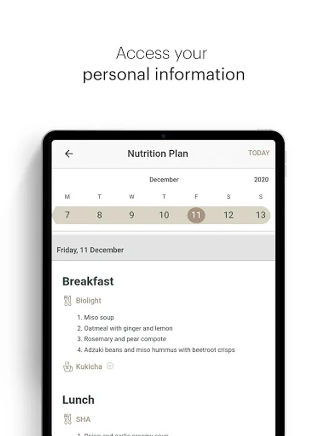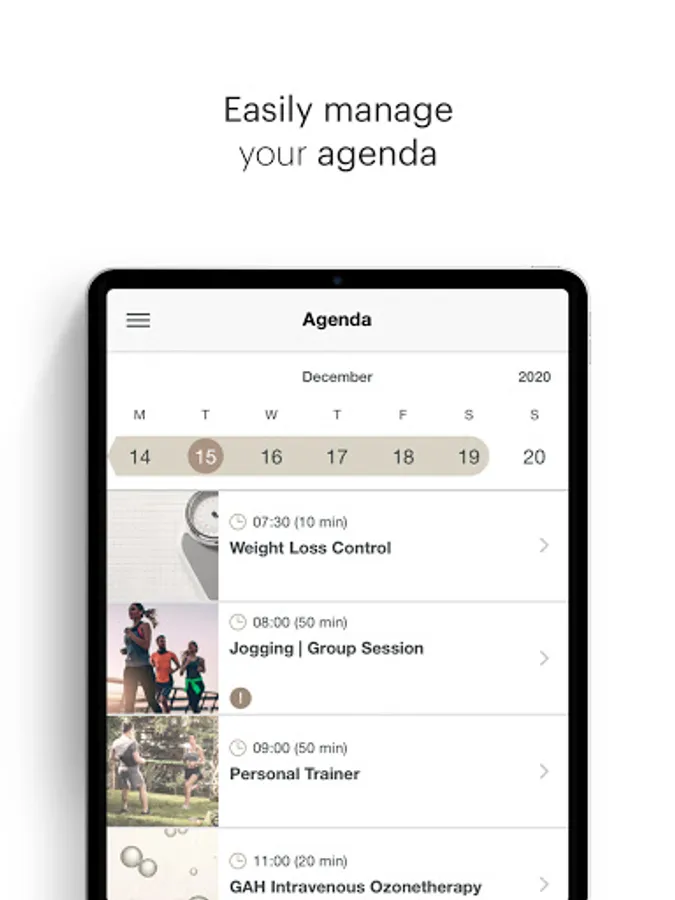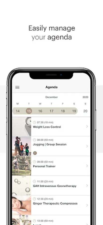 Access your personalized agenda directly and in real-time, as well as treatments, discover the group activities of our Healthy Living Academy, check your nutrition plan, documents and much more.
