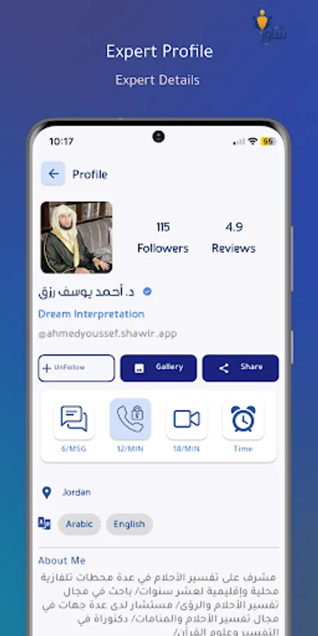 Shawir is an online platform that connects customers with experts, celebrities, and influencers worldwide. Shawir counsellors specialize in marriage and family counseling, marital relationships, interpretation of dreams, psychological, nutrition, physiognomy, personality analysis, technology, health, and diet. We welcome experienced advisors, counsellors, celebrities, and influencers to join this platform.