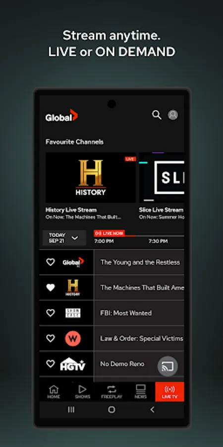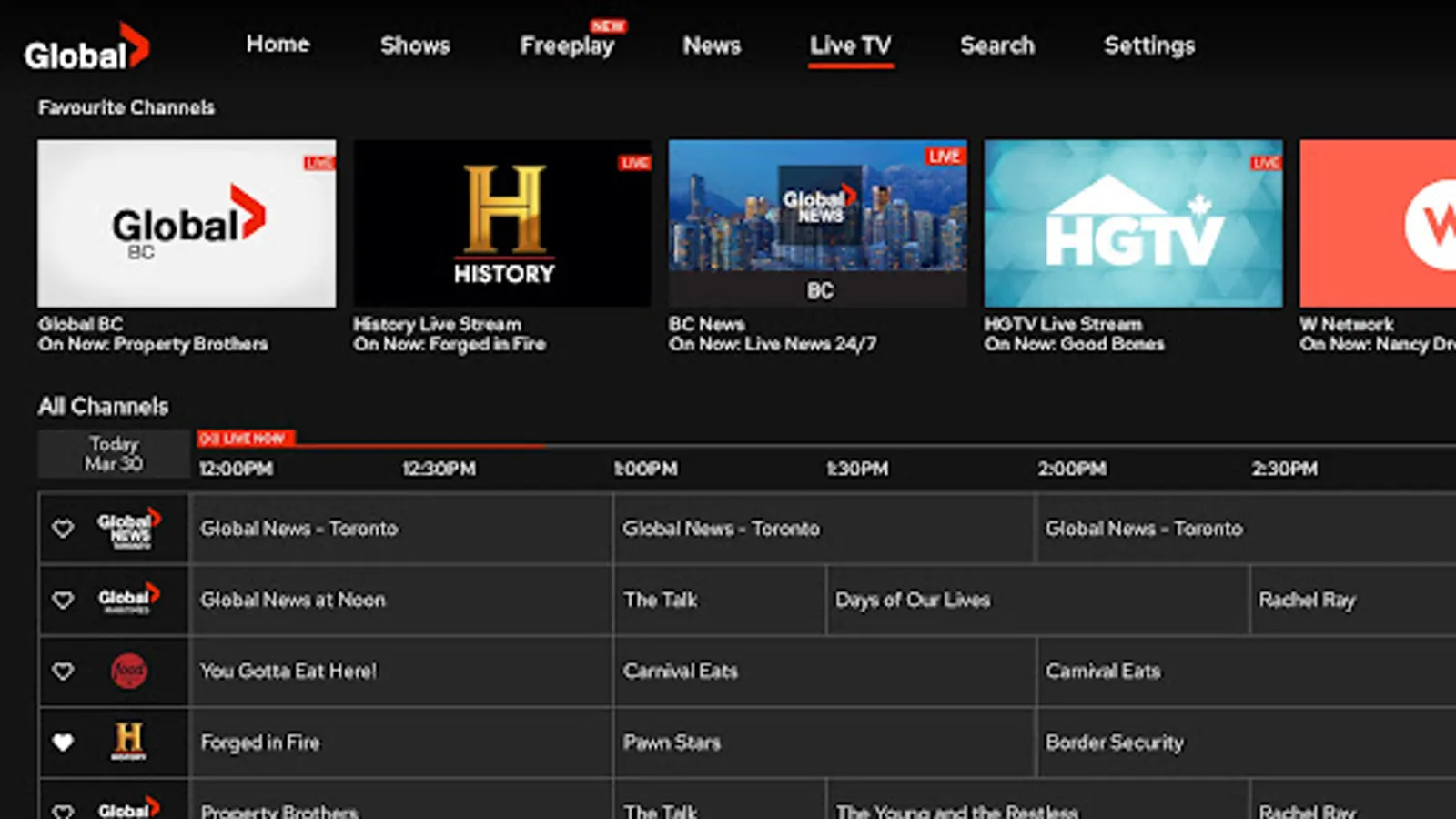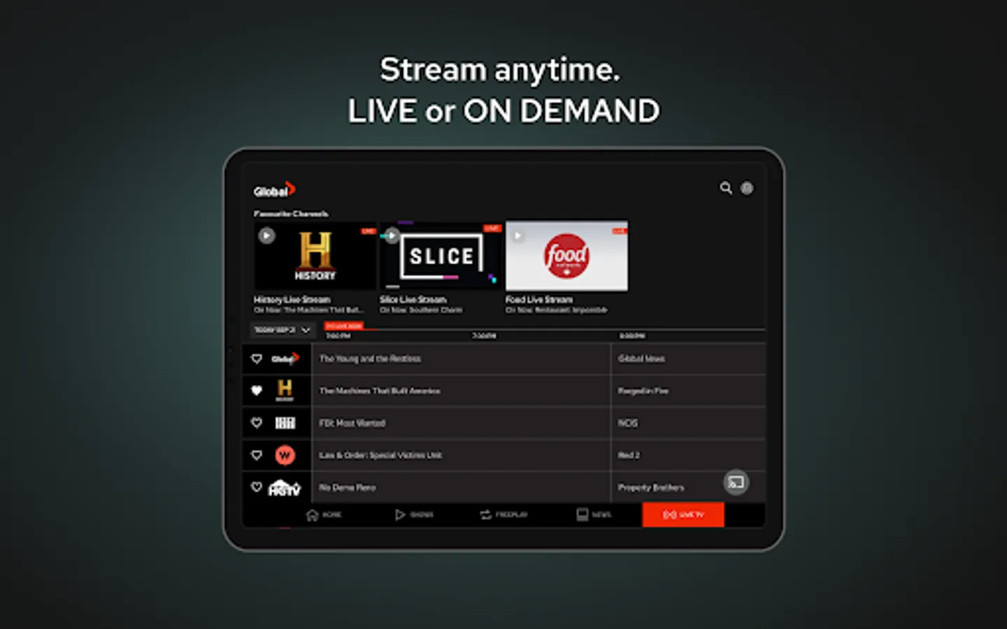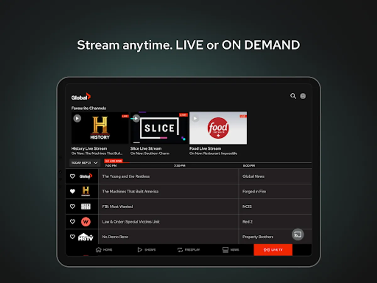 One App's Got It All. The Global TV App is now home to some of the most watched networks in Canada: Global, Food Network, HGTV, W Network, Slice, Showcase, History, Adult Swim and National Geographic!