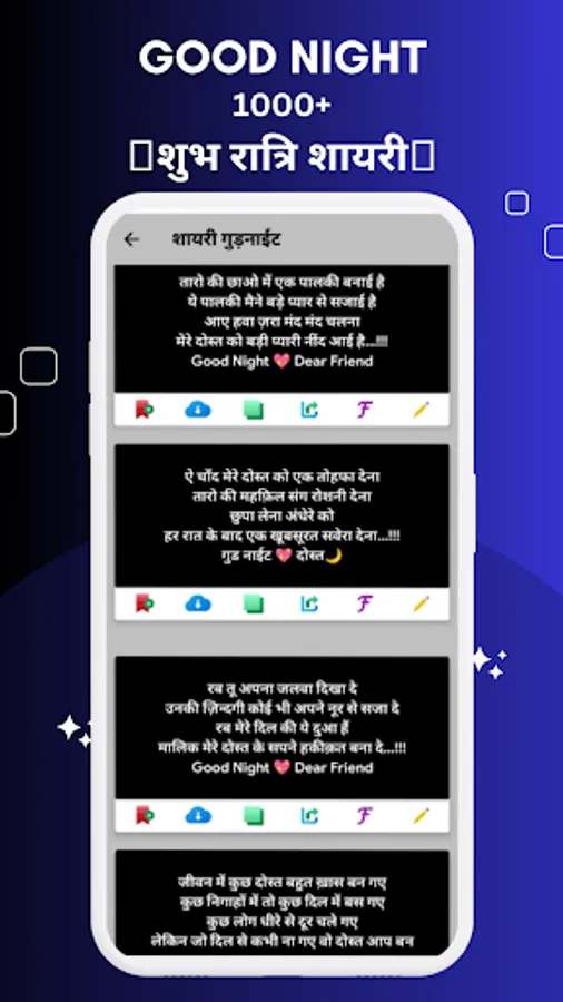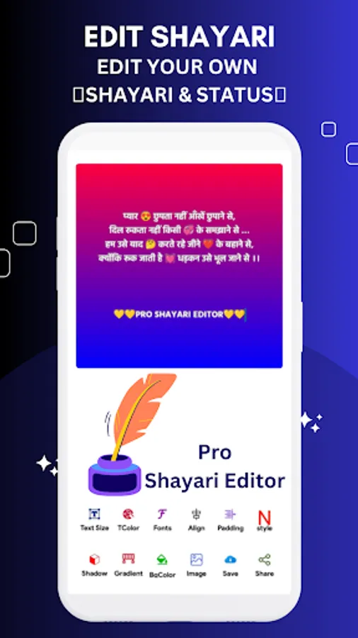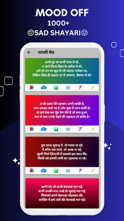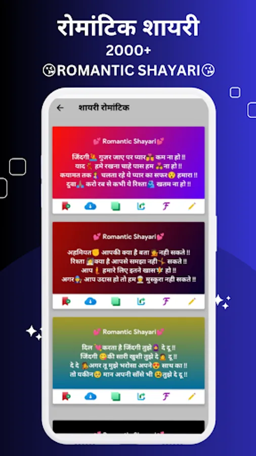 This app is the right place for Specially Love Shayari on every in class categories like Romance ,Miss you Shayari, Pyar Shayari, Mohabbat Shayari, Propose Shayari, Sad Shayari, Bewafa etc.