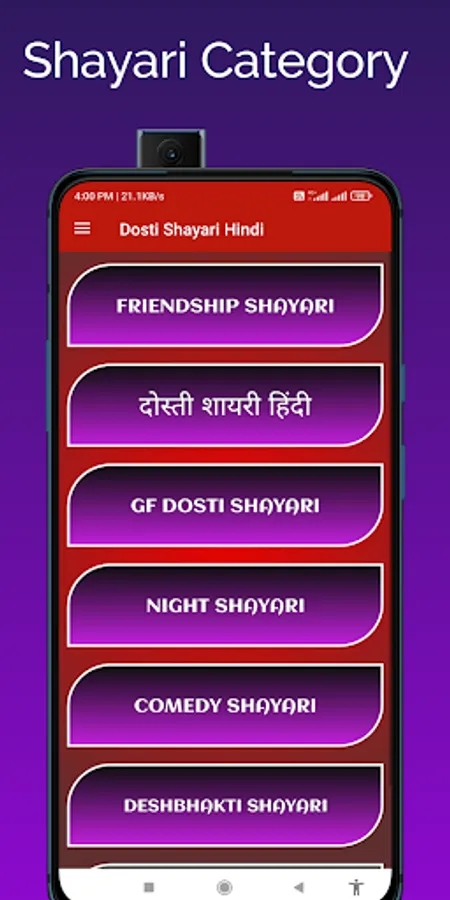 This Dosti Shayari app contains Attitude Shayari, Barish Shayari, Good Morning Shayari, Good Night Shayari, Bewafa Shayari, Comedy Shayari, Miss You Shayari etc.