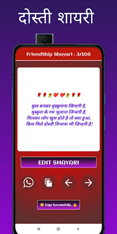 Very easy to use interface just click next and back to read the beautiful friendship shayari in Hindi and easy share to your friends.