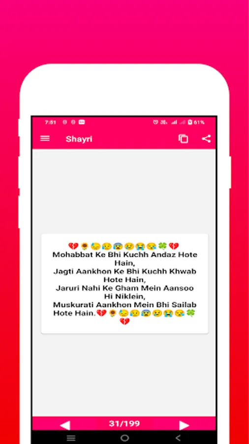 The app is having nice collection of judai shayari and dard shayari also sad shayari.
