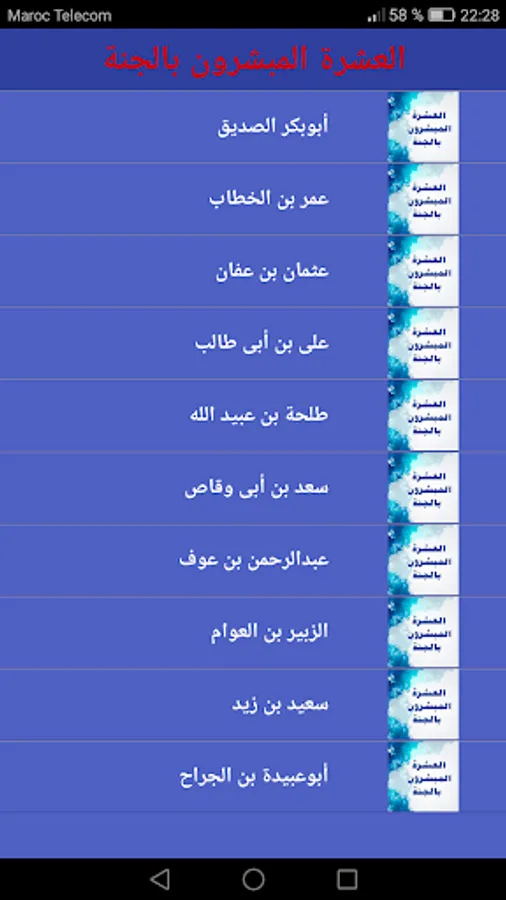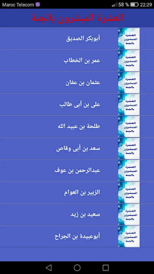 The ten heralds of Paradise are: Abu Bakr Al-Siddiq, Al-Farouq Omar bin Al-Khattab, Dhu al-Nurin Othman bin Affan, the cousin of the Messenger of God Ali bin Abi Talib, Talha bin Ubaid Allah, who is Talha al-Khair or Talha al-Fayyad, al-Zubayr ibn al-Awam, the disciple of the Messenger of God, and Saad bin Abi A storyteller, and the Secretary of the Ummah, Abu Ubaidah bin Al-Jarrah, Abdul-Rahman bin Auf, the owner of righteousness and expenses, and Saeed bin Zaid. peace be upon him: "Abu Bakr in Paradise, and Omar in Paradise, and Uthman in Paradise, and Ali in Paradise, and Talha in Paradise, Zubair in Paradise, and Abdul Rahman bin Auf in Paradise, and Saad in Paradise, and happy in Paradise, and Abu Obeida Ben surgeon the Paradise" .