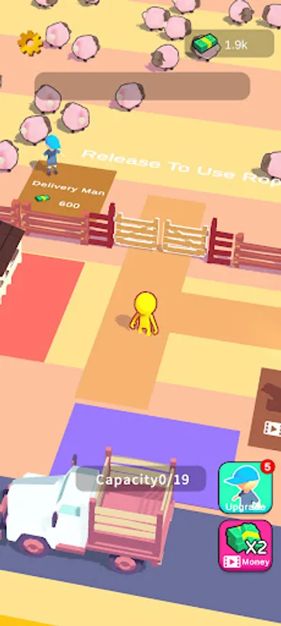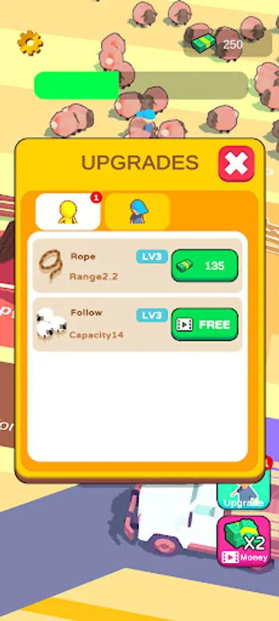 Starting with a small rope, the sheep are caught and sold. Upgrade with cash. The higher the level, the more efficient you are at catching sheep, and you can hire helpers to catch sheep with you. Open up new pastures!