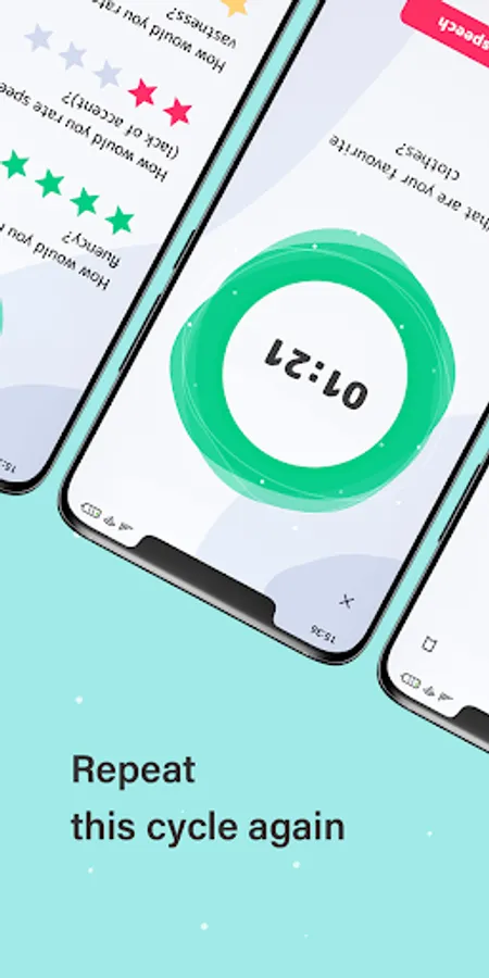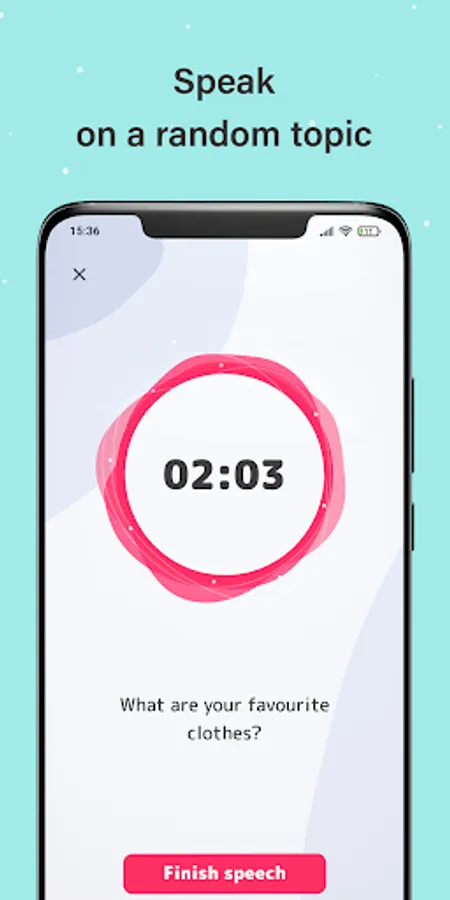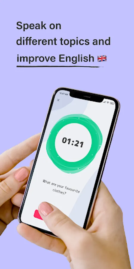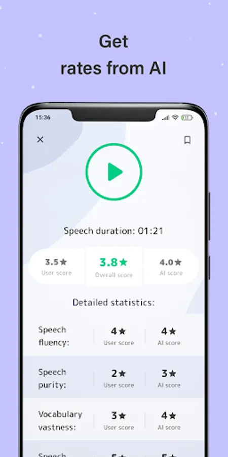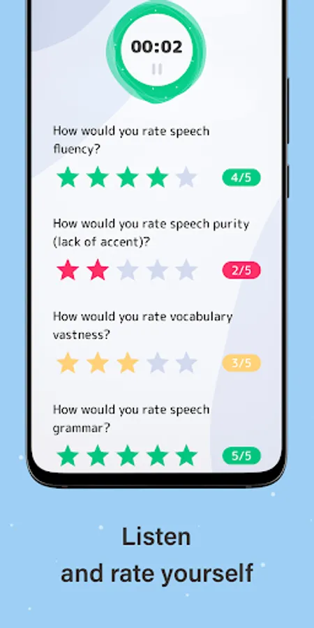 Our English speaking offline app includes hundreds of interesting questions and topics for your speeches. At first, the application generates a random topic and you can either skip it or start practicing. While you're speaking on the generated topic we record your voice so that the AI can analyze it after completion. After that you should listen to your speech and rate yourself on several criteria: speech fluency, speech purity, vocabulary vastness and grammar. At the same time, Artificial Intelligence analyzes your speech and also rates it. In the end, our English speaking practice app gives you the average result of your own and AI rates.
