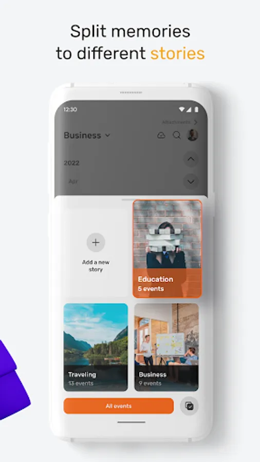 Story timeline creator provides the ability to quickly look back and navigate events and dates. This is achieved by zoom and scroll capabilities of the journal app. With just a few gestures you can easily time hop to any date or time of lifetime, which is perfect for creating your own dream journal or travel journal notebook. There is an ability to track events both in the general timeline and in other stories you've created (for example, business timeline, travel timeline, etc.).