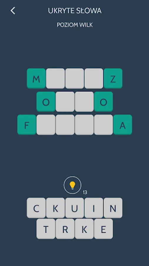 After selecting a level and a task, a set of words to guess will appear on the screen. For your convenience, the first and last letters of each are displayed. Your task is to match the jumbled letters - shown at the bottom of the screen.